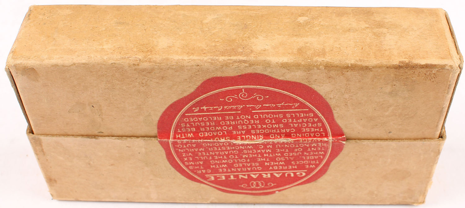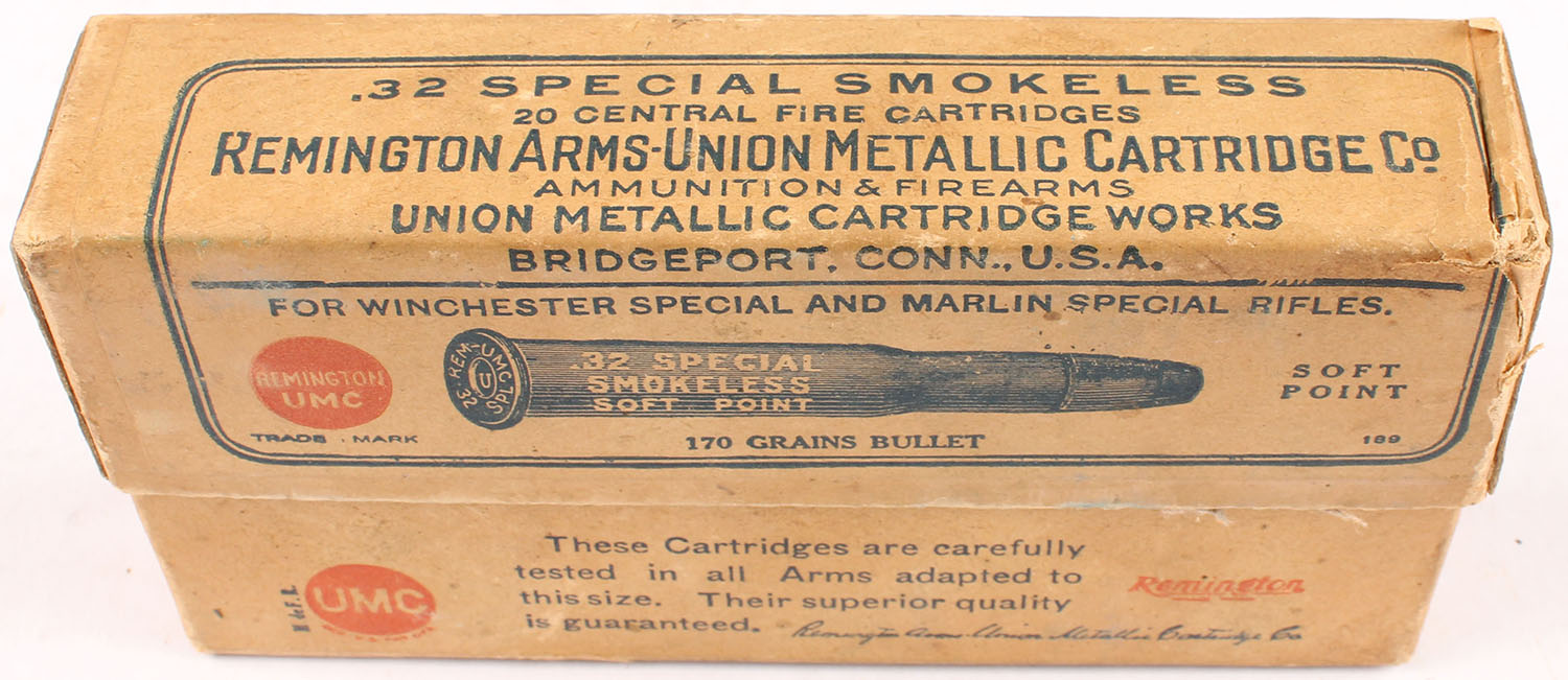 REM-UMC, .32 Winchester Special, Smokeless, 170 Grain Soft Point Bullet, Full, 2pc. Buff box with buff label, box is solid with excellent color, very minor age soiling, some corner wear, very minor edge wear, label is intact, ammo is excellent. Grade: Excellent - Value: 40 to 120