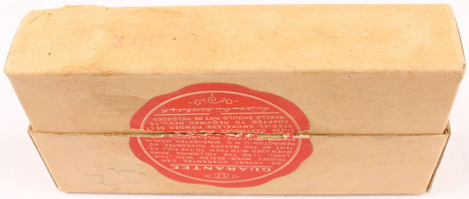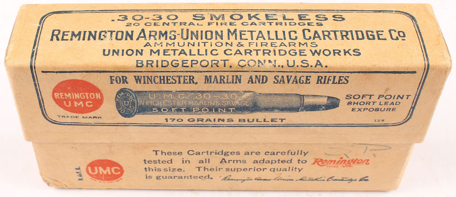 REM-UMC, .30-30 Winchester, 170 Grain Soft Point Bullet, Full, 2pc. Buff box with buff label, box is solid with excellent color, very minor corner wear, edges are crisp, labels are intact, front has been written on, ammo is excellent. Grade: Excellent + - Value: 40 to 120