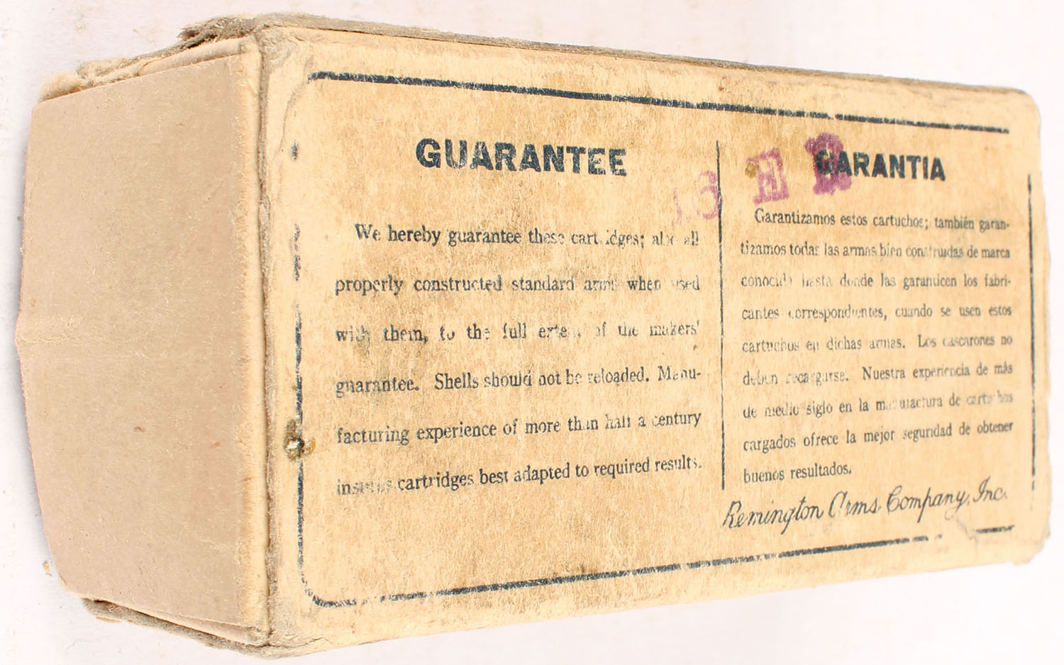 REM-UMC, .38 Special, 158 Grain Lead Bullet, Smokeless, Partial 44rds. Of incorrect ammo, 1pc. Buff box, box is missing both end flaps, very good color, some age soiling & shelf wear, staining on top, edge & corner wear, ammo is very good. Grade: Good + - Value: 8 to 40