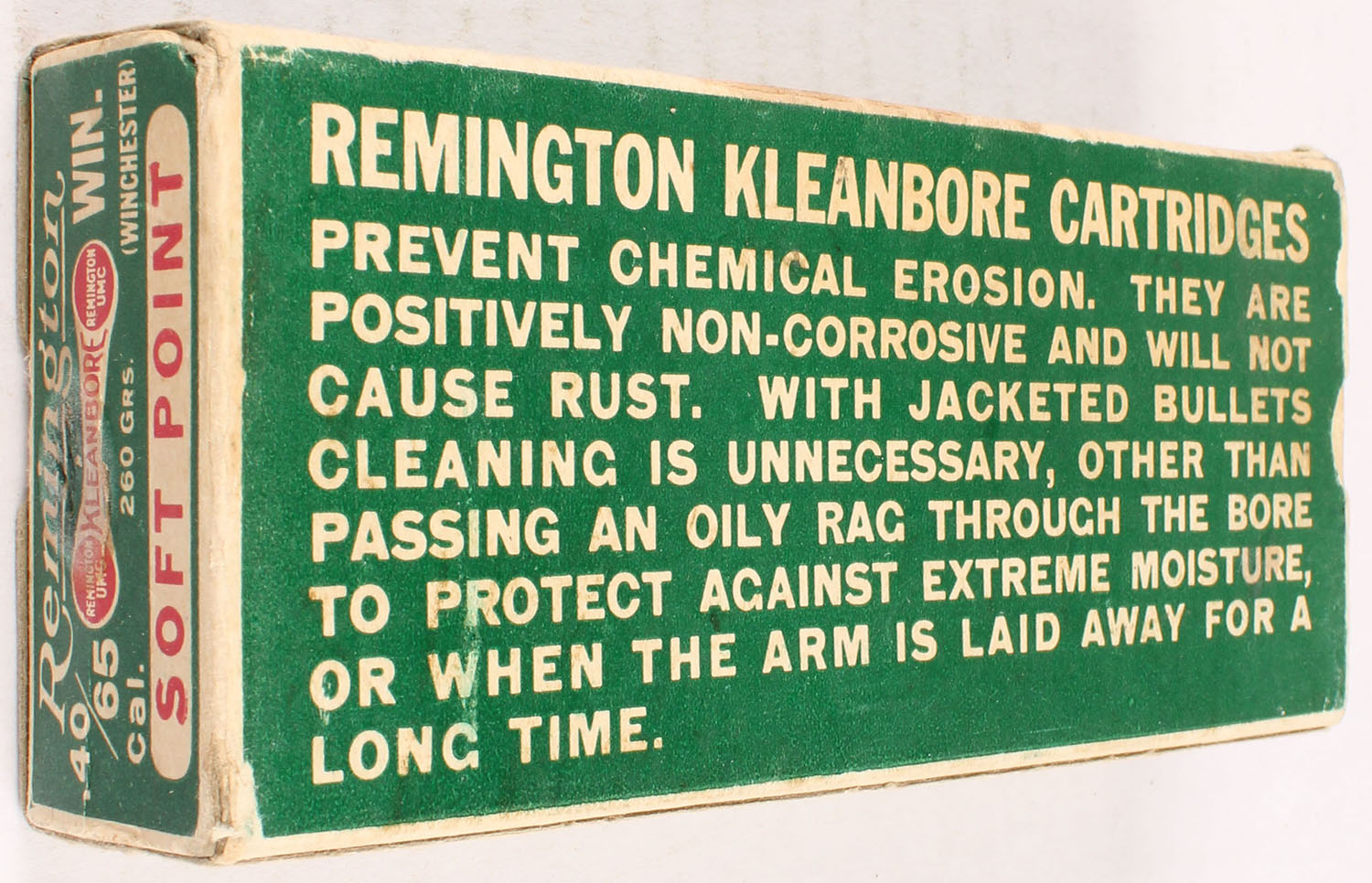 Remington, Kleanbore, .40-65 Winchester, 260 Grain Soft Point Bullet, Full, 1pc. Green buff & red dogbone box, box is solid with excellent color, minor age soiling, some edge & corner wear, end flaps are solid, ammo is excellent. Grade: Excellent + - Value: 50 to 200