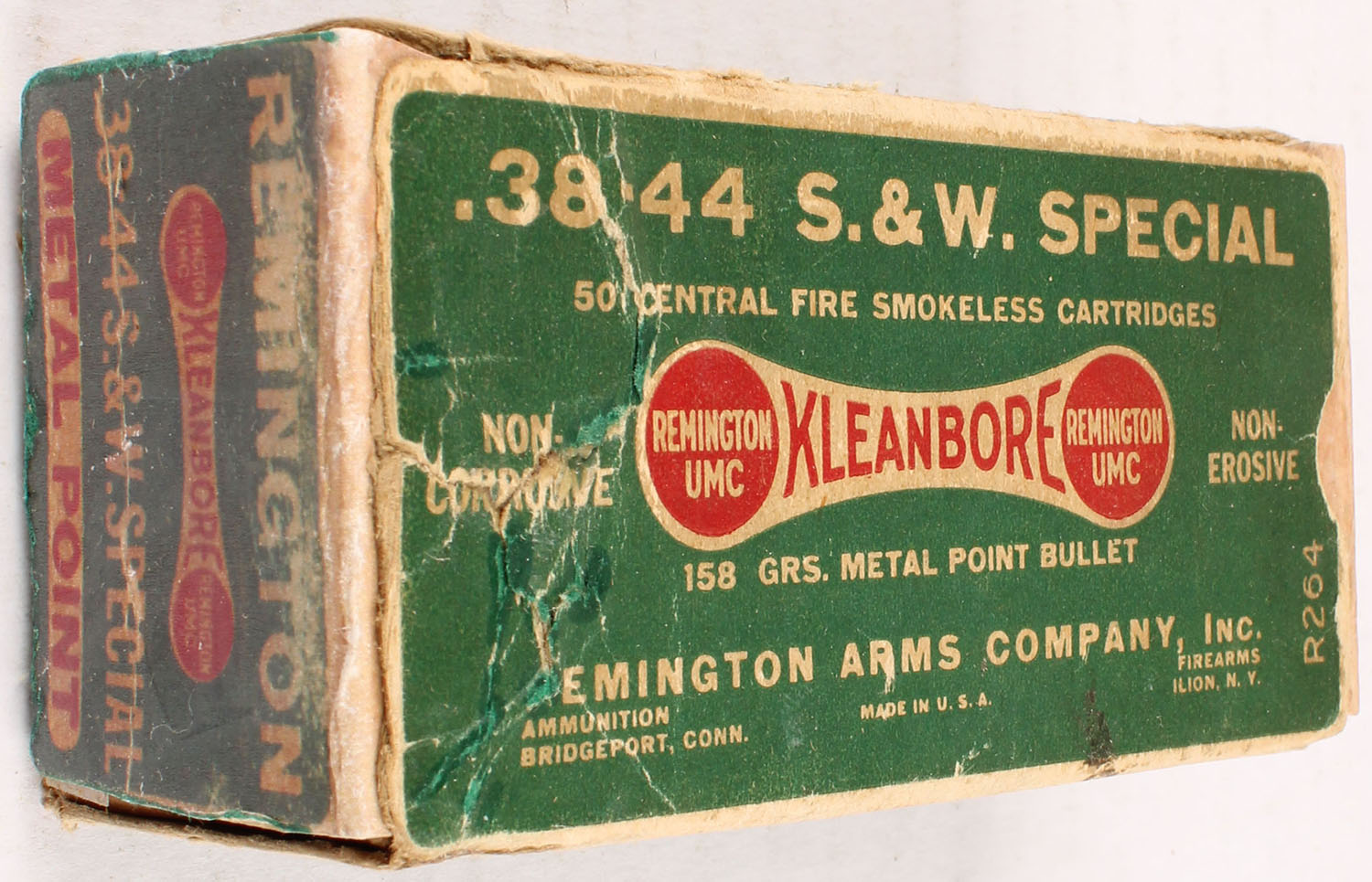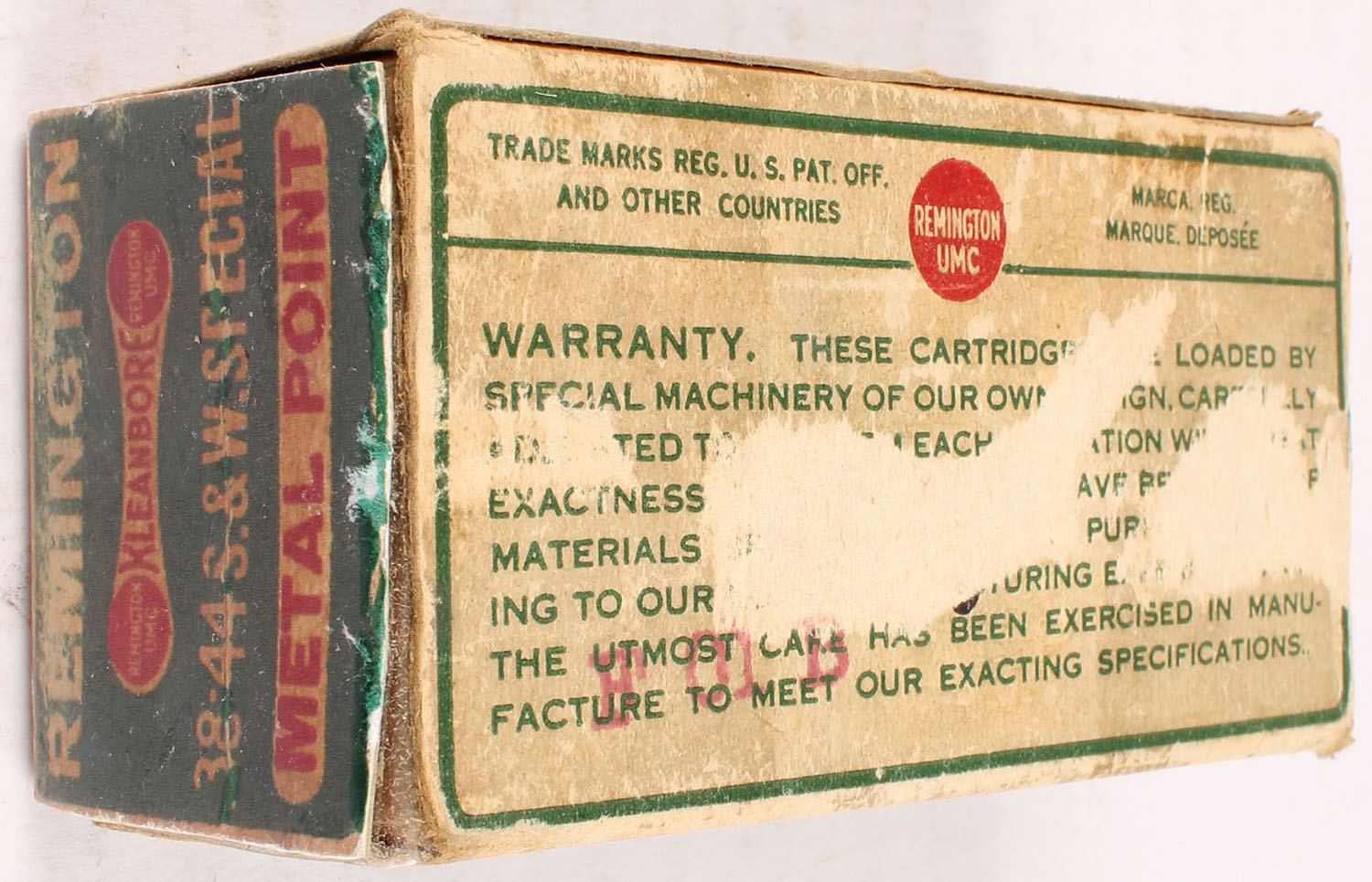Remington, Kleanbore, .38-44 Smith& Wesson Special, 158 Grain Metal Point Bullet, Full, 1pc. Green buff & red dogbone box, both end flaps are torn & taped, box has good color, age soiling, some color repairs, edge & corner wear, ammo is excellent. Grade: Good + - Value: 50 to 150