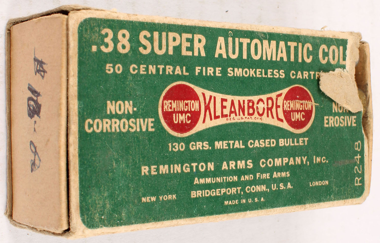 Remington, Kleanbore, .38 Super Automatic Colt, 130 Grain Metal Cased Bullet, Full, 1pc. Green buff & red dogbone box, missing both end flaps, tear on right end, very good color, some age soiling, corner wear, minor edge wear, ammo is excellent. Grade: Good ++ - Value: 10 to 40