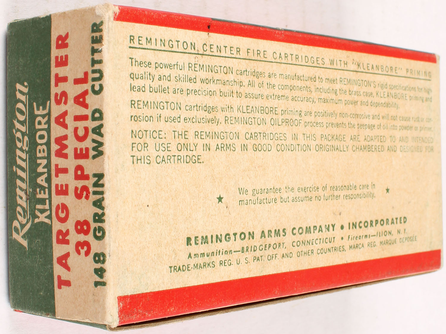 Remington, Kleanbore Targetmaster, .38 Special, 148 Grain Wad Cutter, Full of mixed H/S, 1pc. Green white & red box, box is solid with excellent color, minor age soiling & shelf wear, minor corner wear, very minor edge wear, end flaps are solid, ammo is excellent. Grade: Excellent - Value: 10 to 40