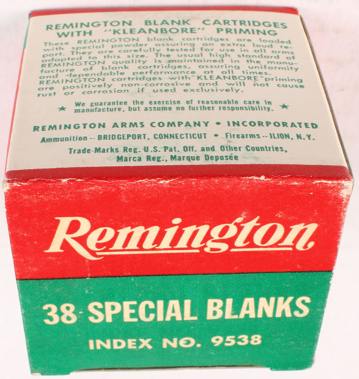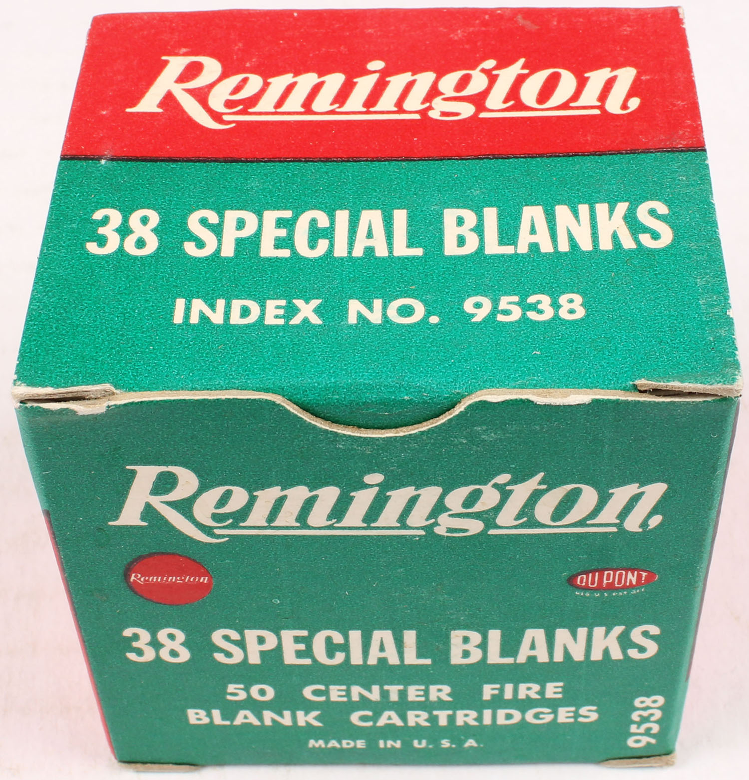 Remington, .38 Special Blanks, Extra Loud Report, Full, 1pc. Green red & white box, box is solid with excellent color, very minor shelf & corner wear, edges are crisp, top flap is solid, ammo is excellent. Grade: Excellent ++ - Value: 10 to 50