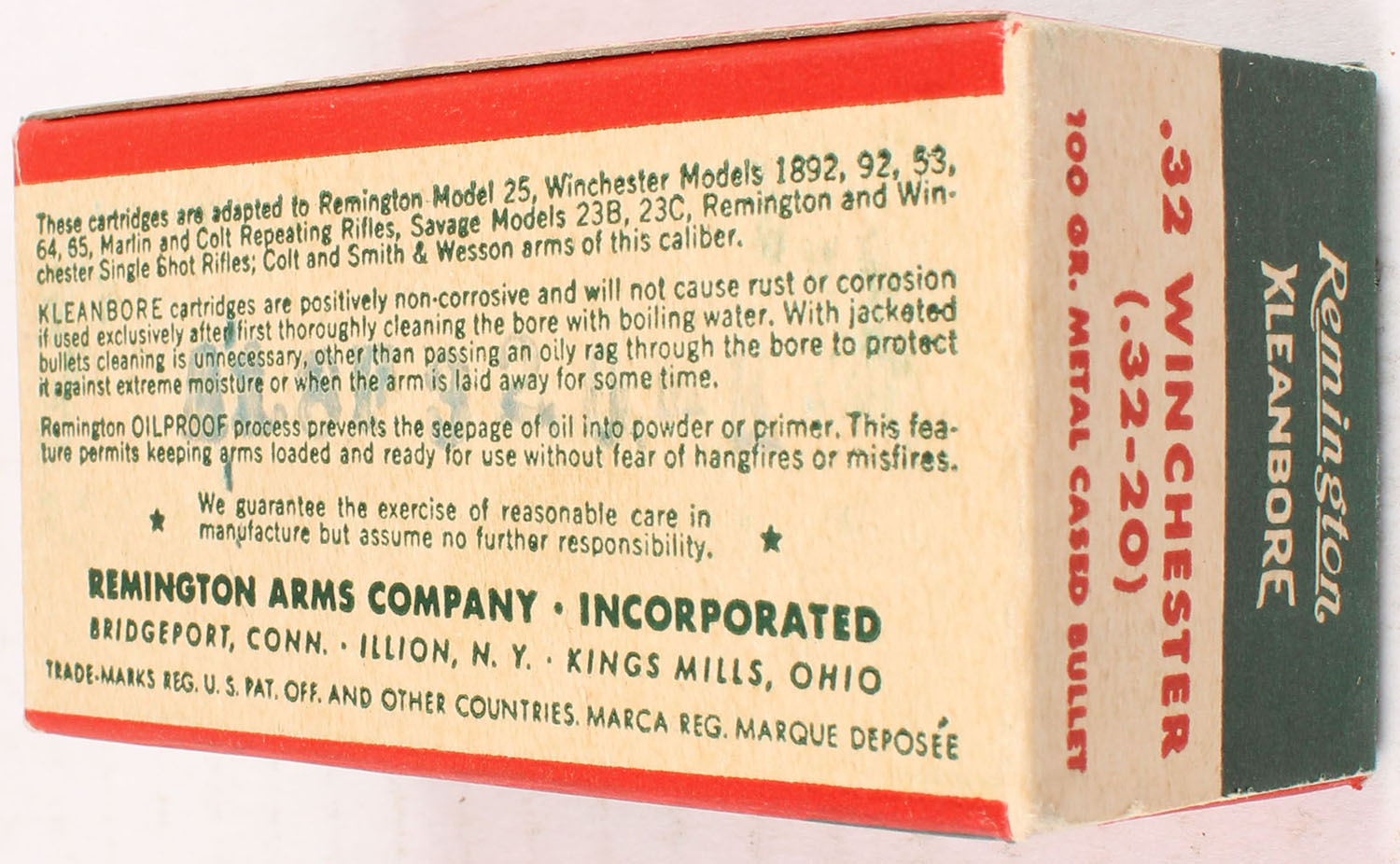Remington, Kleanbore, .32 Winchester (.32-20), 100 Grain Metal Cased Bullet, Full, 1pc. Green red & white box, box is near mint with excellent to minty color, only very minor age soiling, corners are mostly sharp, edges are crisp, end flaps are solid, ammo is excellent. Grade: Excellent ++ - Value: 60 to 180