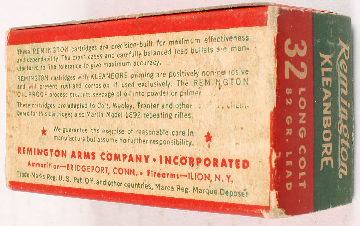 Remington, Kleanbore, .32 Long Colt, 82 Grain Lead Bullet, Full, 1pc. Green red & white box, box is solid with very good to excellent color, minor age soiling, scuffing, top has been written on, some corner wear, edges are mostly crisp, end flaps are solid, ammo is excellent. Grade: Very Good ++ - Value: 60 to 180