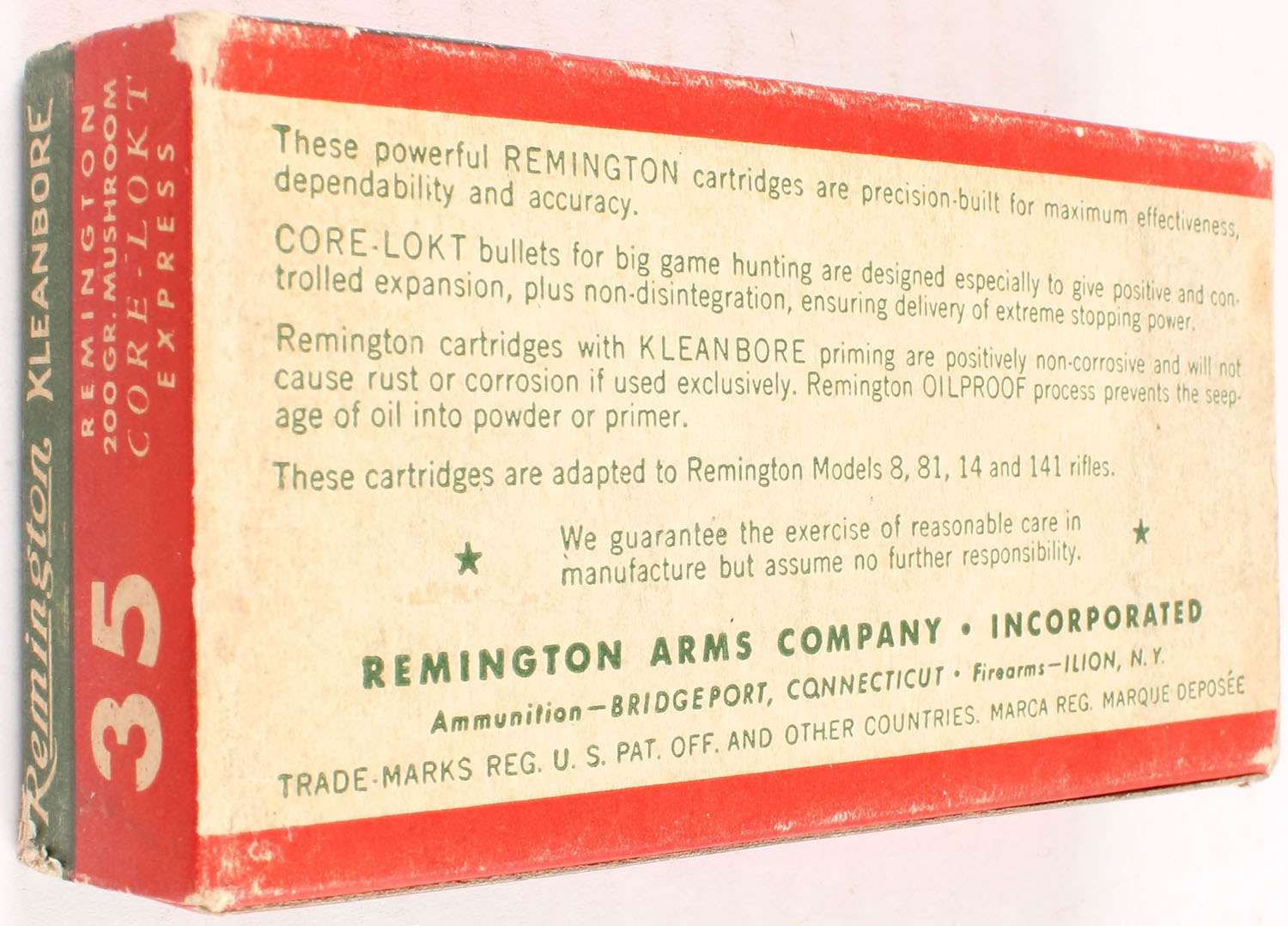 Remington, Kleanbore Express, .35 Remington, 200 Grain Mushroom Core-Lokt Bullet, Full, 1pc. Green white & red box, box is solid with very good to excellent color, minor age soiling, some shelf & corner wear, minor edge wear, end flaps are solid, ammo is excellent. Grade: Excellent - Value: 30 to 90