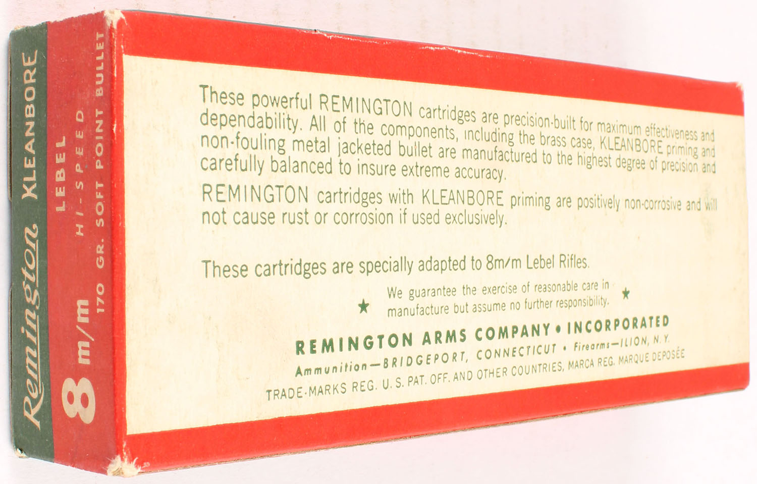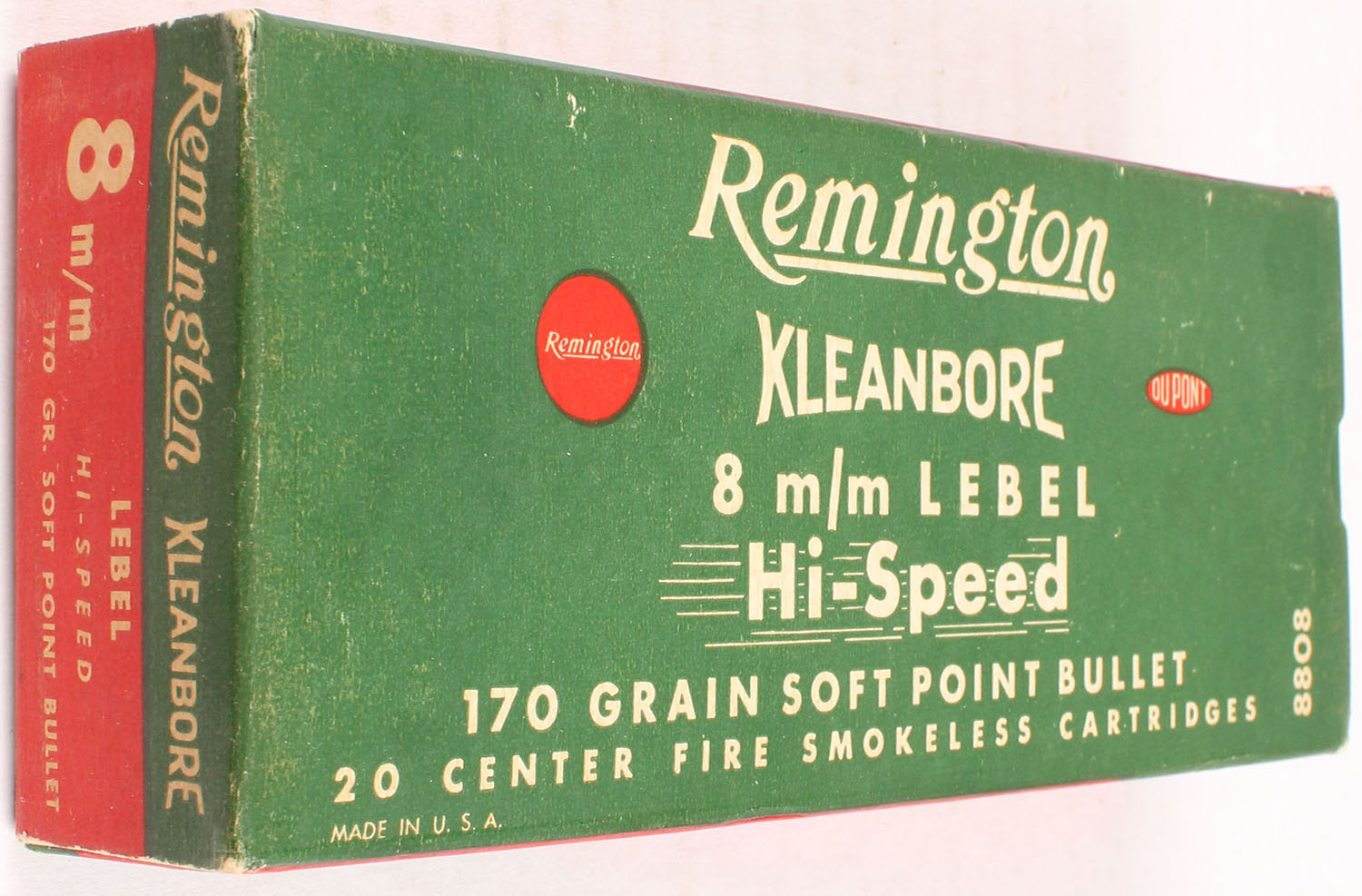 Remington, Kleanbore Hi-Speed, 8mm Lebel 170 Grain Soft Point Bullet, Full, 1pc. Green white & red box, box is solid with excellent color, very minor age soiling & shelf wear, minor corner wear, edges are mostly crisp, end flaps are solid, ammo is excellent. Grade: Excellent + - Value: 40 to 120