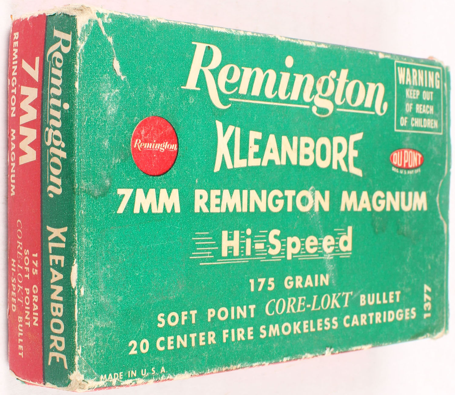 Remington, Kleanbore Hi-Speed, 7mm Remington Magnum, 175 Grain Soft Point Core-Lokt Bullet, Full, 1pc. Green white & red box, box is solid with excellent color, shelf wear, some edge & corner wear, end flaps are solid, ammo is excellent. Grade: Very Good + - Value: 20 to 60