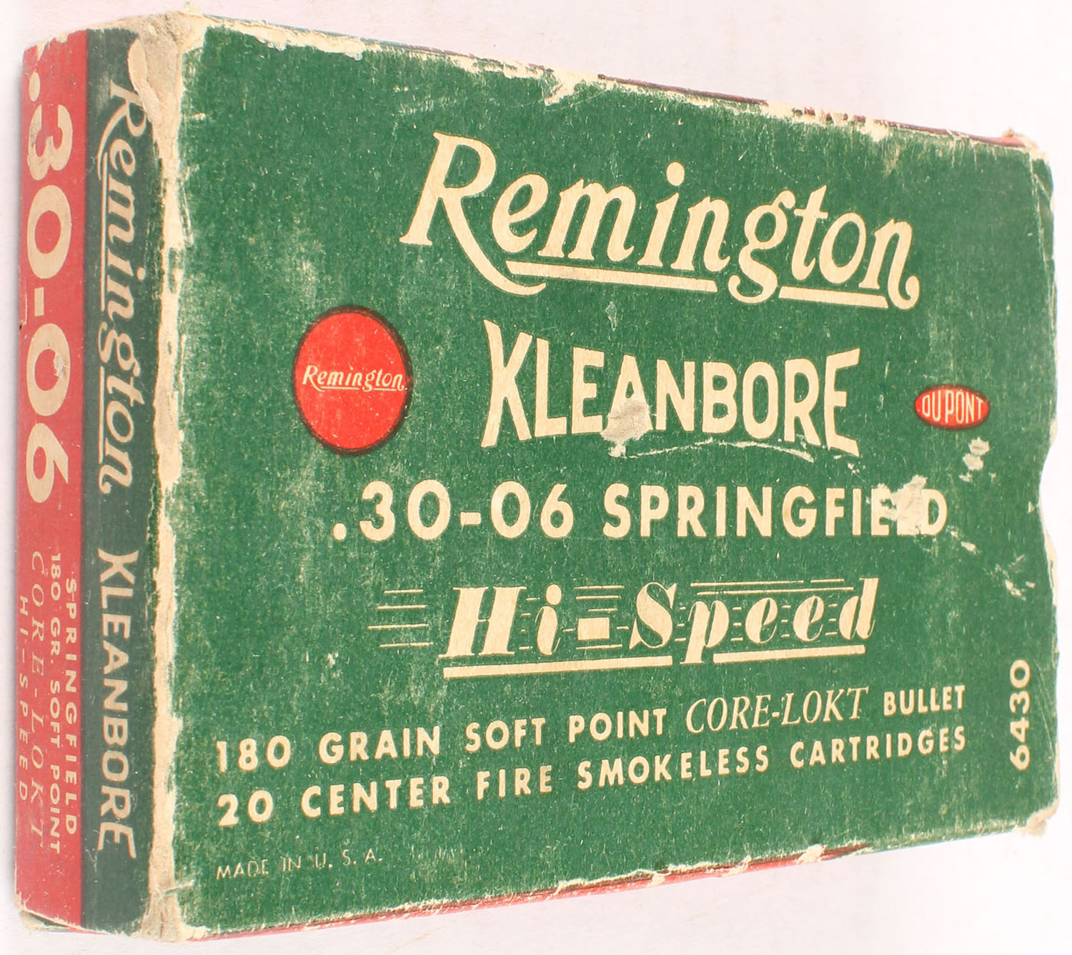Remington, Kleanbore Hi-Speed, .30-06 Springfield, 180 Grain Soft Point Core-Lokt Bullet, Partial 18rds. Of incorrect ammo, 1pc. Green white & red box, missing right end flap, very good color, some age soiling & shelf wear, some edge & corner wear, left end flap is solid, ammo is excellent. Grade: Very Good - Value: 8 to 40