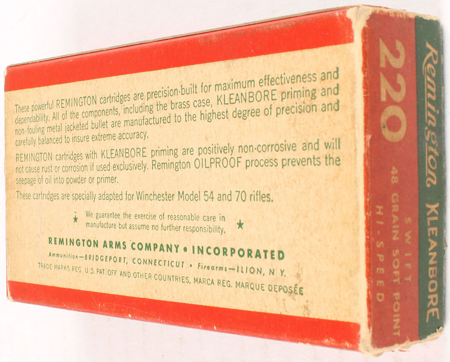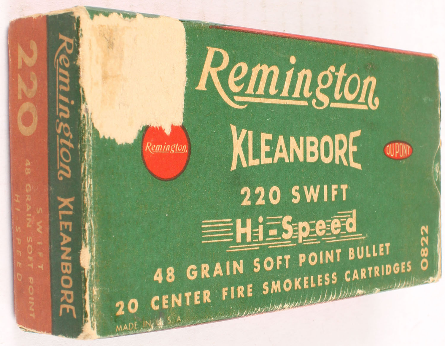 Remington, Kleanbore Hi-Speed, .220 Swift, Hi-Speed, 48 Grain Soft Point Bullet, Full, 1pc. Green white & red box, box is solid with good to very good color, age soiling, scuff on top, some edge & corner wear, end flaps are solid, ammo is excellent. Grade: Very Good - Value: 40 to 120