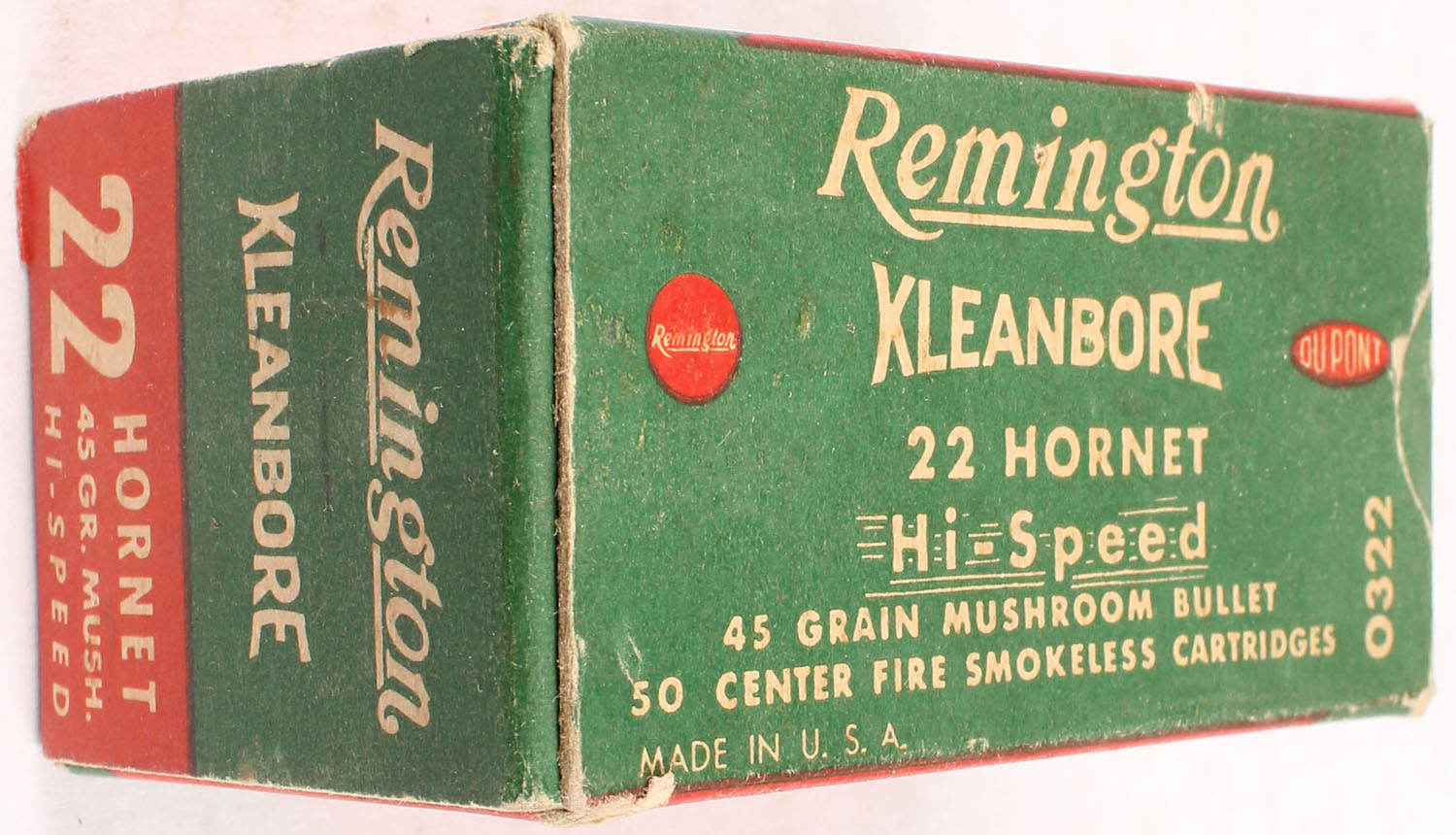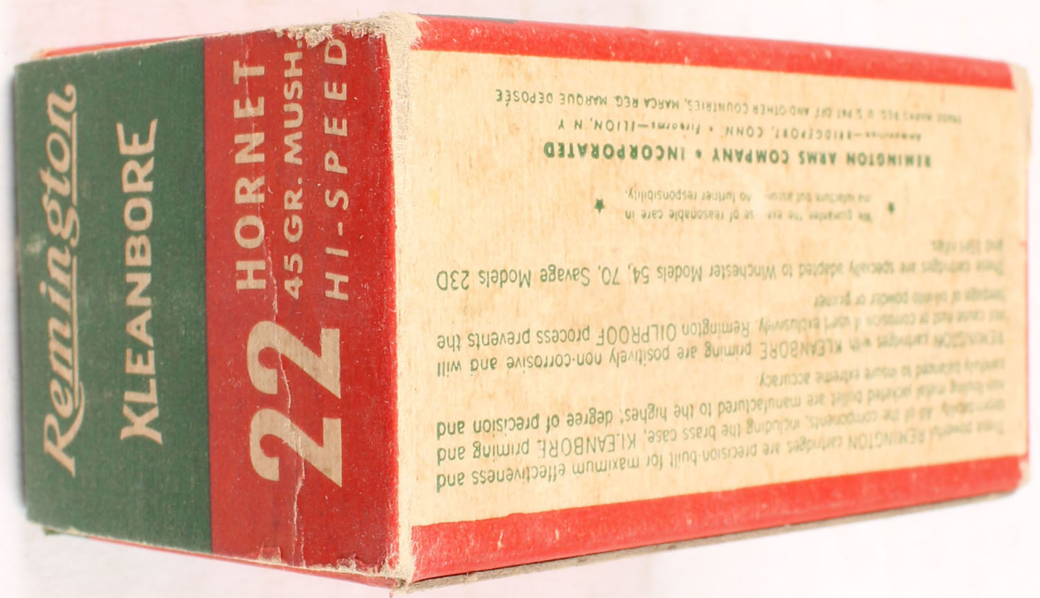 Remington, Kleanbore Hi-Speed, .22 Hornet, 45 Grain Mushroom Bullet, Full, 1pc. Green red & white box, box is solid with very good to excellent color, minor age soiling, some corner wear, front has been written on, edges are crisp, end flaps are solid, ammo is excellent. Grade: Very Good ++ - Value: 40 to 120