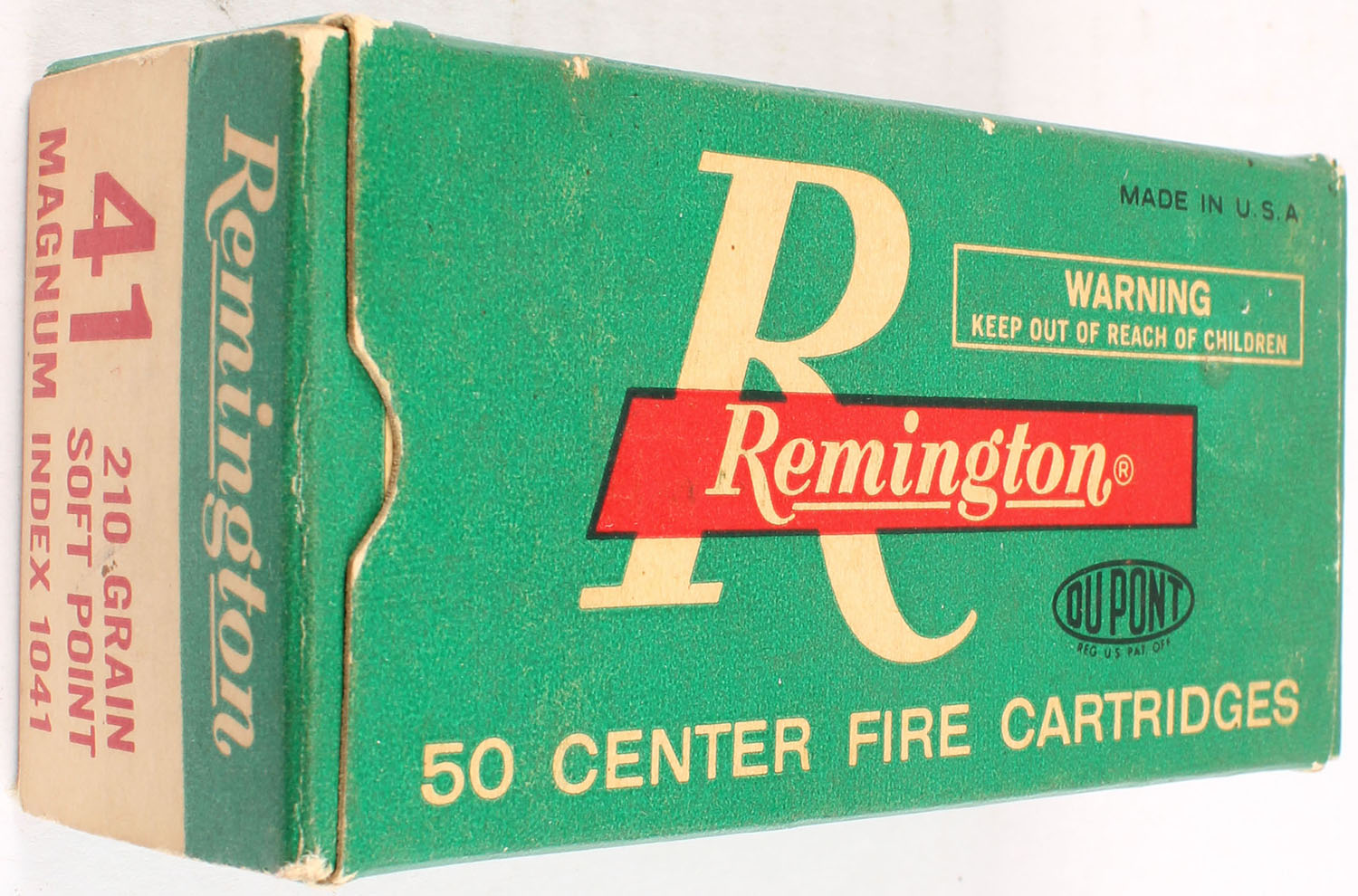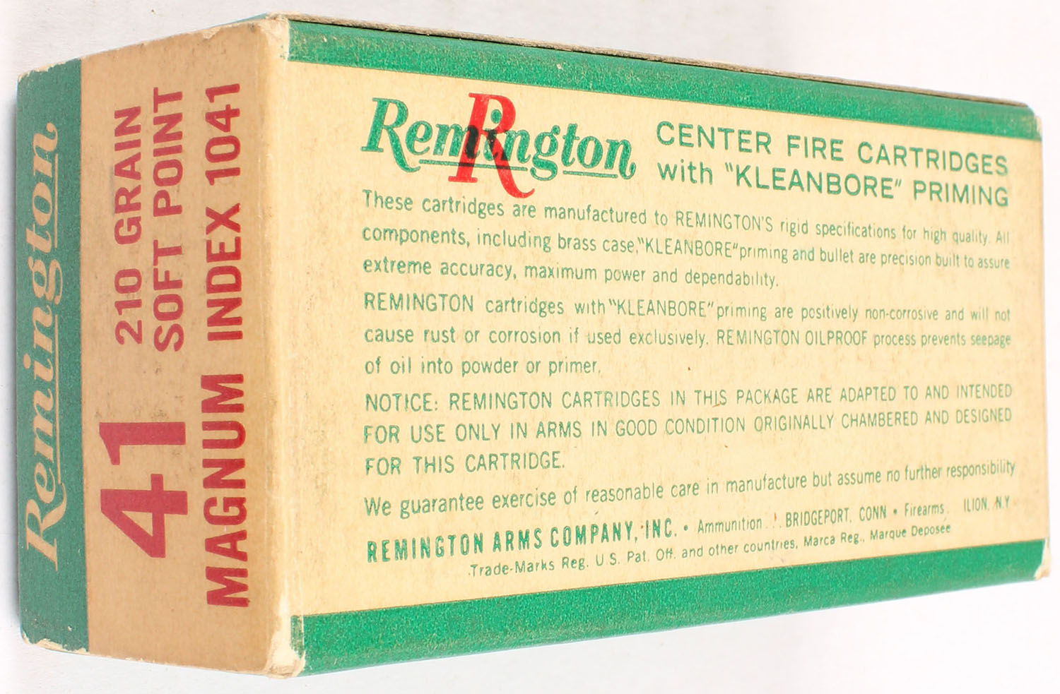 Remington, .41 Magnum, 210 Grain Soft Point, Full, 1pc. Green white & red box, box is solid with very good color, some age soiling, minor corner wear edges are mostly crisp, end flaps are solid, ammo is excellent. Grade: Excellent - Value: 20 to 60
