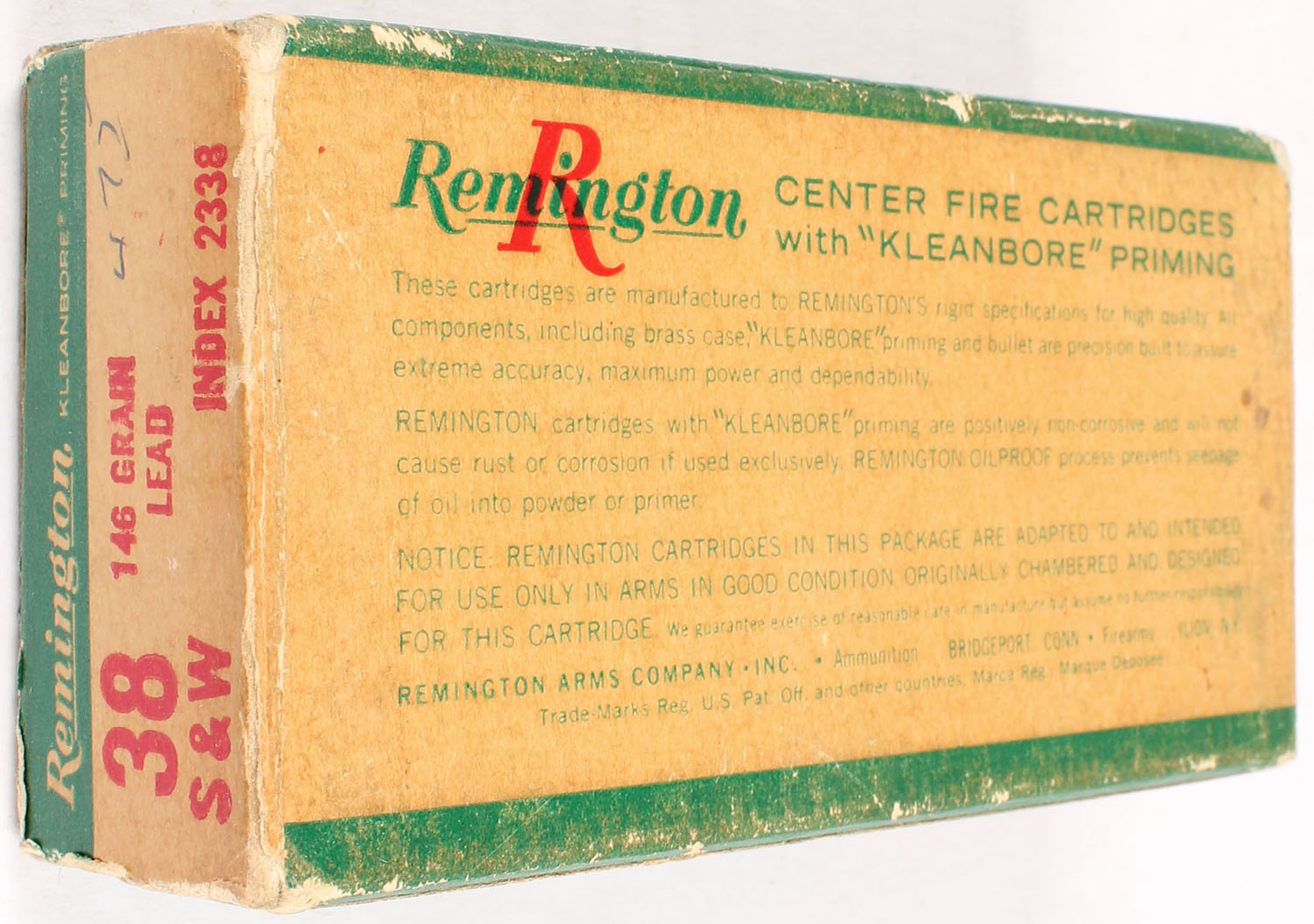 Remington, .38 Smith & Wesson, 146 Grain Lead, Full, 1pc. Green white & red box, box is solid with very good color, some age soiling, minor shelf wear, some corner & edge wear, end flaps are solid, right end has been written on, ammo is excellent. Grade: Very Good ++ - Value: 20 to 60