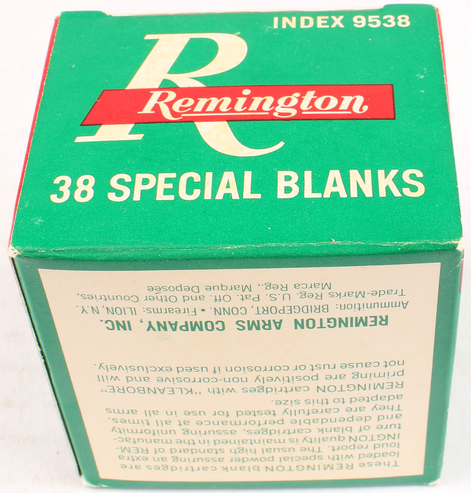 Remington, .38 Special Blanks, Extra Loud Report, Full, 1pc. Green white & red box, box is near mint with minty color, only has very minor corner wear, edges are crisp, top flap is solid, ammo is minty. Grade: Excellent ++ - Value: 10 to 50