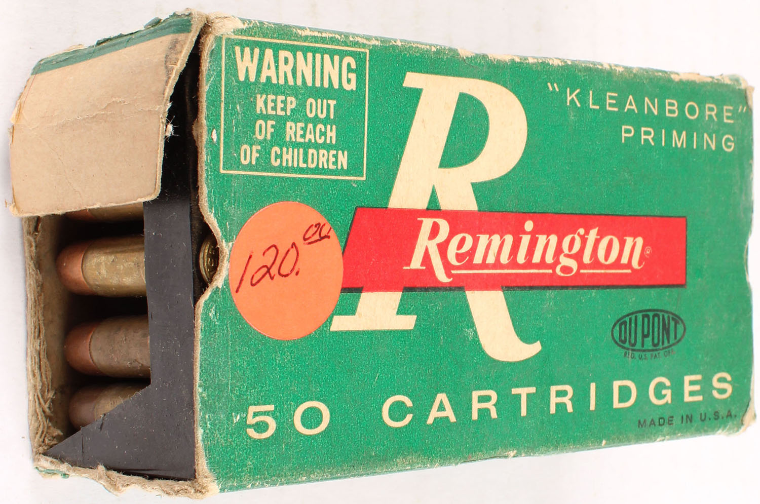 Remington, .351 Winchester Self Loading, 180 Grain Soft Point Bullet, Partial 49rds. (24rds. Correct), 1pc. Green white & red box, missing left end flap, seam split to bottom back edge, good color, age soiling, corner wear, some edge ear, right end flap is solid, ammo is excellent. Grade: Fair - Value: 20 to 100