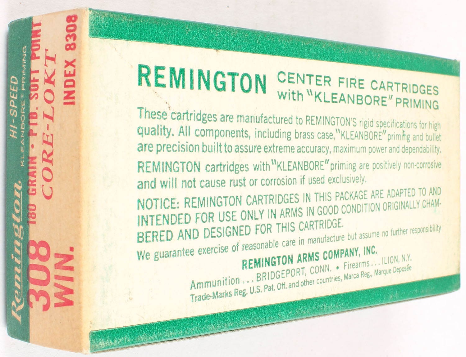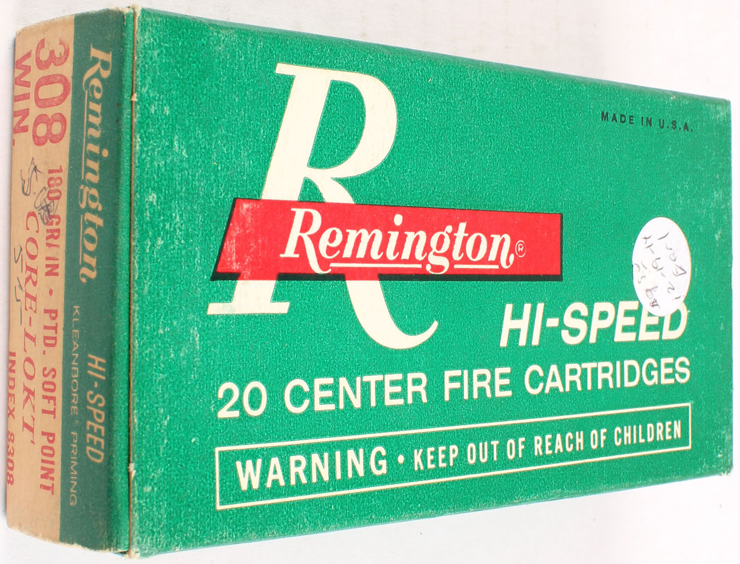Remington, Hi-Speed, .308 Winchester, 180 Grain Pointed Soft Point Core-Lokt, Full, 1pc. Green white & red box, box is solid with excellent color, minor shelf wear, very minor corner wear, edges are crisp, sticker on top, left end has been written on, end flaps are solid, ammo is excellent. Grade: Very Good ++ - Value: 20 to 60
