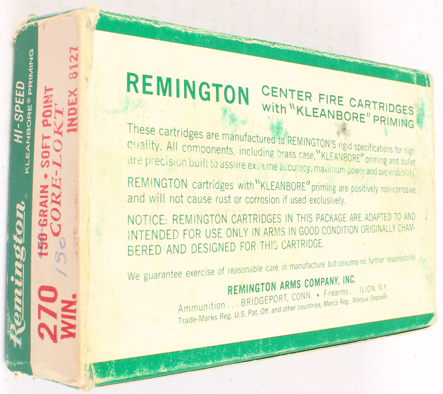 Remington, Hi-Speed, .270 Winchester, Full of incorrect ammo, 1pc. Green white & red box, box is solid with good color, some age soiling, shelf wear, some edge & corner wear, end flaps are solid, ammo is very good. Grade: good - Value: 2 to 20