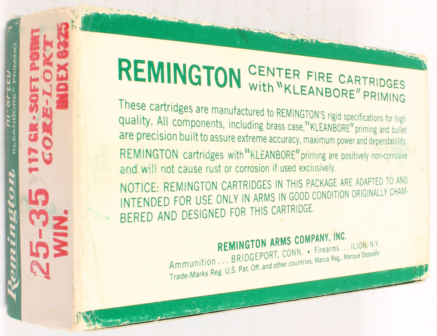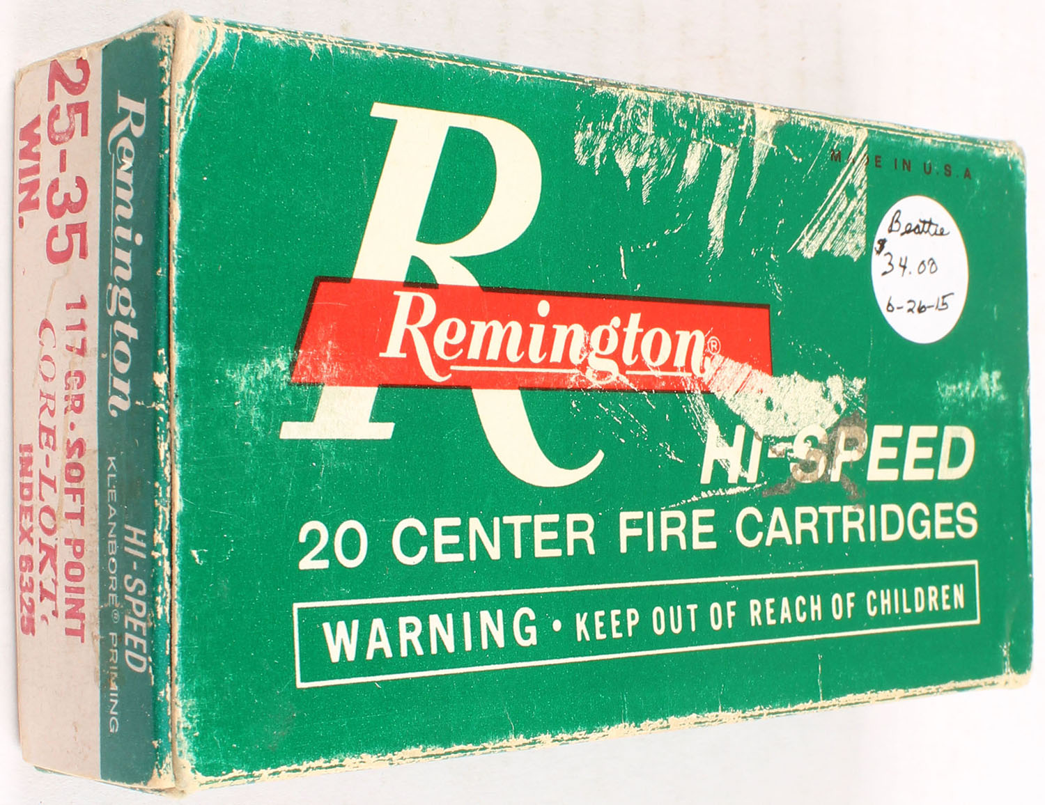 Remington, Hi-Speed, .25-35 Winchester, 117 Grain Soft Point Core-Lokt, Full, 1pc. Green white & red box, box is solid with excellent color, some shelf wear & staining on top, some edge & corner wear, sticker on top, end flaps are solid, ammo is excellent. Grade: Very Good - Value: 30 to 90