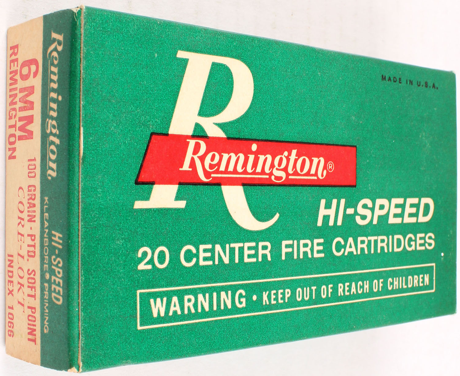 Remington, Hi-Speed, 6mm Remington, 100 Grain Pointed Soft Point Core-Lokt, Full, 1pc. Green white & red box, box is solid with excellent color, very minor age soiling, corners are mostly sharp, edges are crisp, end flaps are solid, ammo is excellent. Grade: Excellent + - Value: 20 to 60