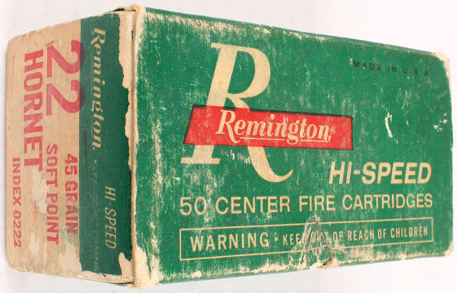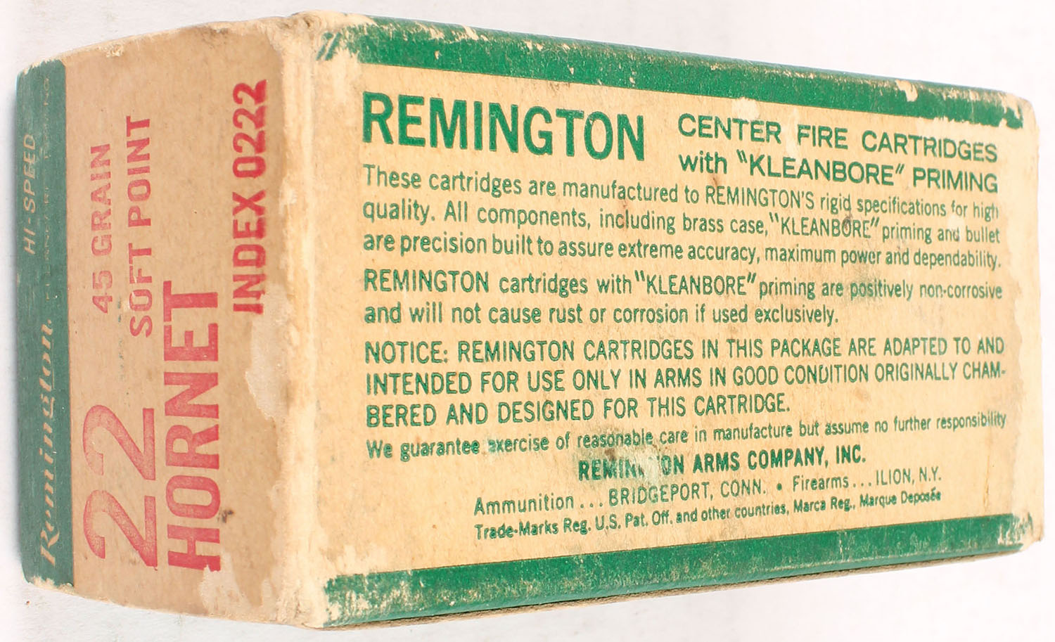 Remington, Hi-Speed, .22 Hornet, 45 Grain Soft Point, Full (37rds. Correct), 1pc. Green white & red box, box is solid with good color, age soiling, edge & corner wear, end flaps are solid, ammo is excellent. Grade: Good ++ - Value: 40 to 120