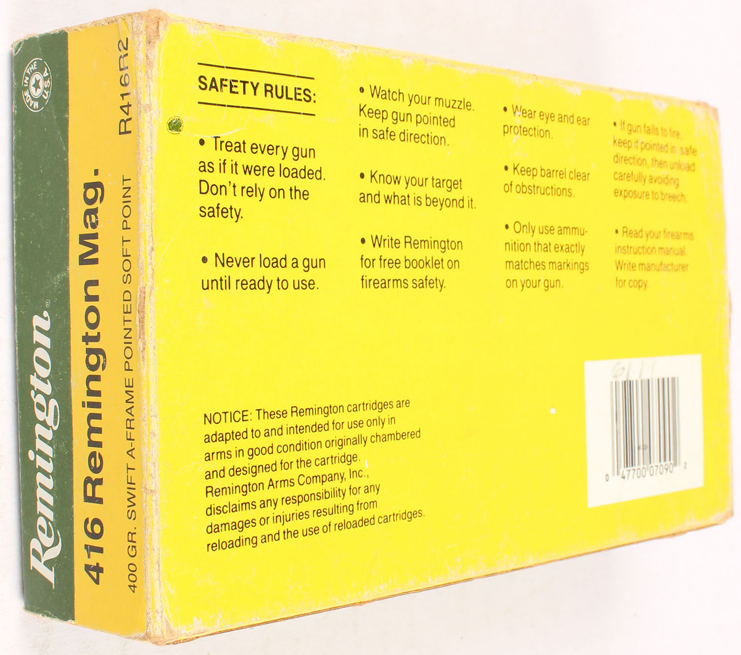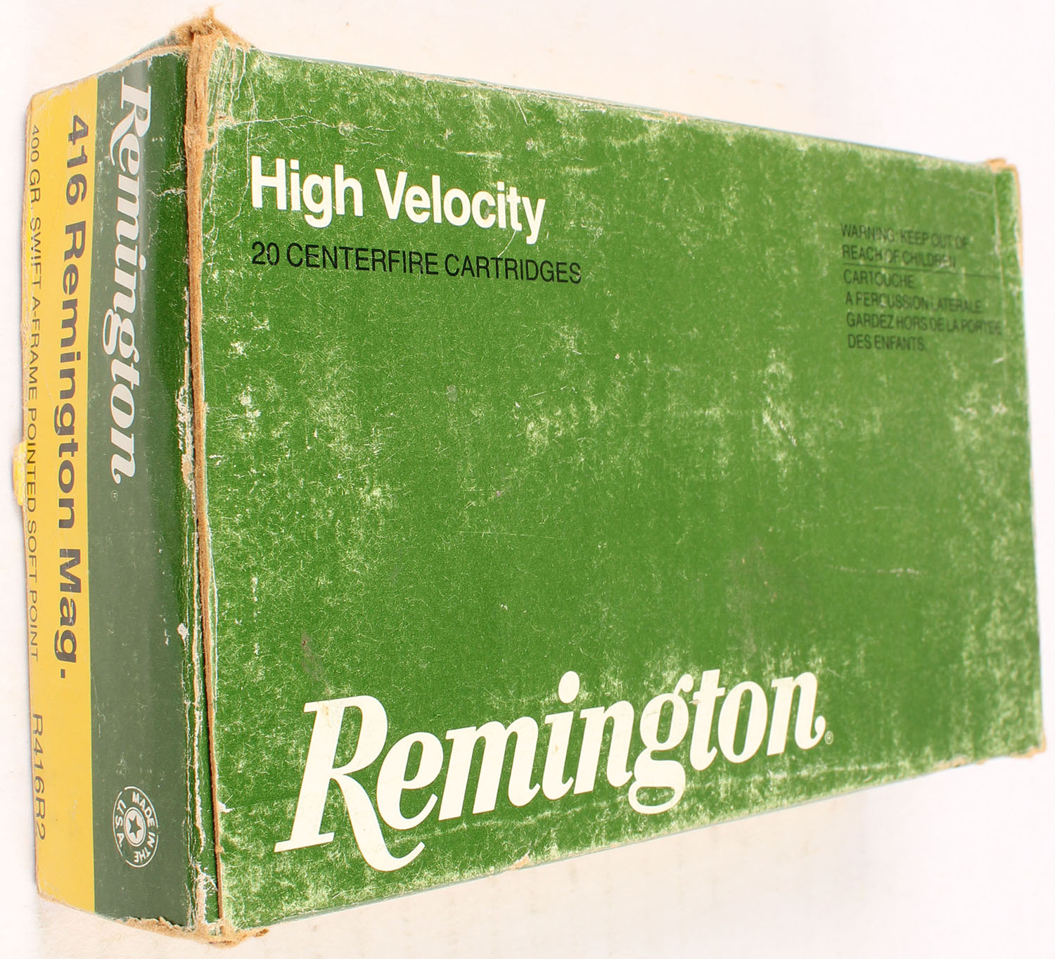 Remington, High Velocity, .416 Remington Magnum, 400 Grain Swift A-Frame Pointed Soft Point, Full, 1pc. Green yellow & white box, box is solid with very good to excellent color, some shelf wear, some edge & corner wear, end flaps are solid, ammo is excellent. Grade: Very Good ++ - Value: 20 to 60