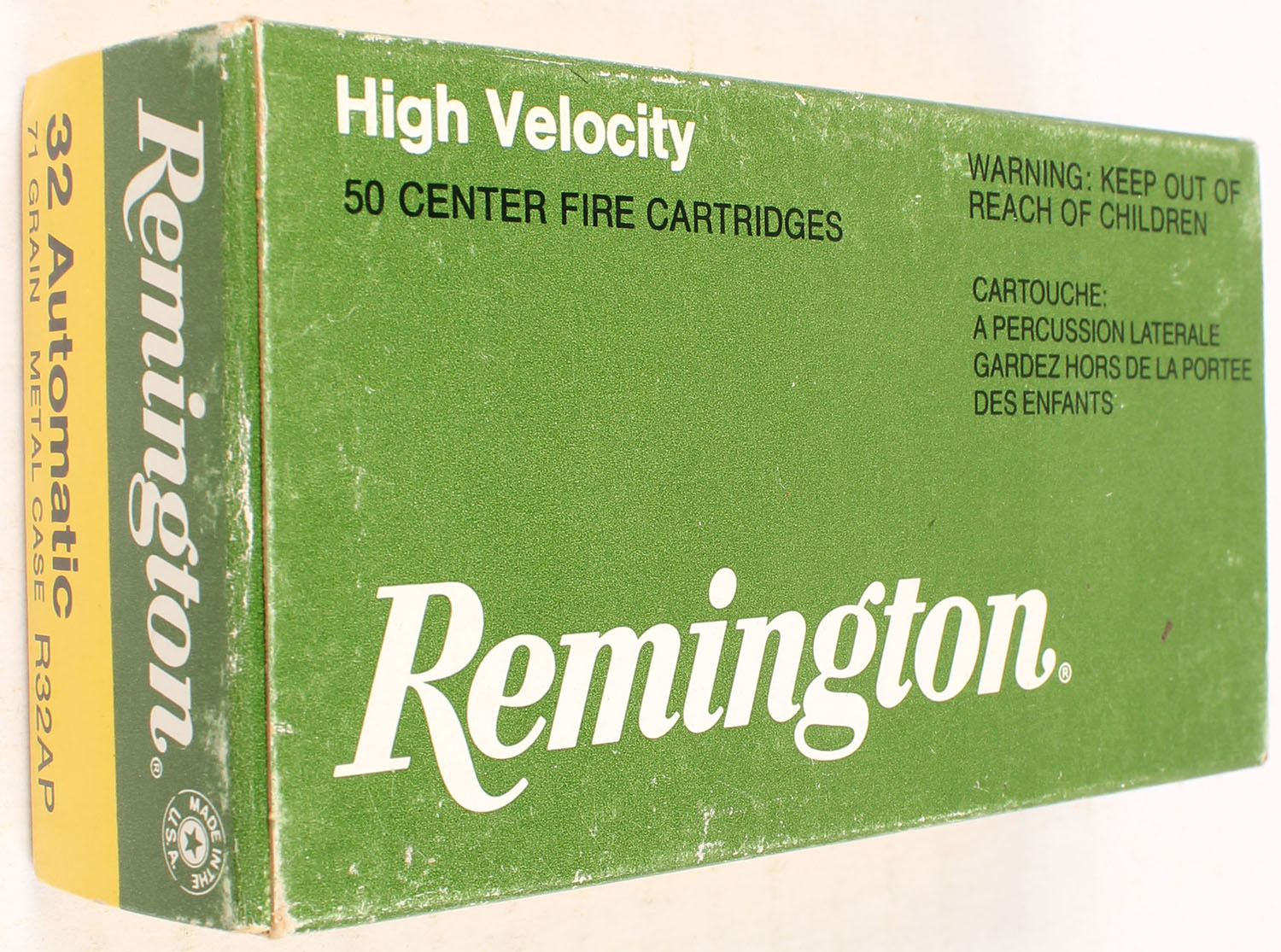 Remington, High Velocity, .32 Automatic, 71 Grain Metal Case, Full, 1pc. Green yellow & white box, box is solid with excellent color, very minor shelf & corner wear, edges are mostly crisp, end flaps are solid, ammo is minty. Grade: Excellent + - Value: 10 to 40