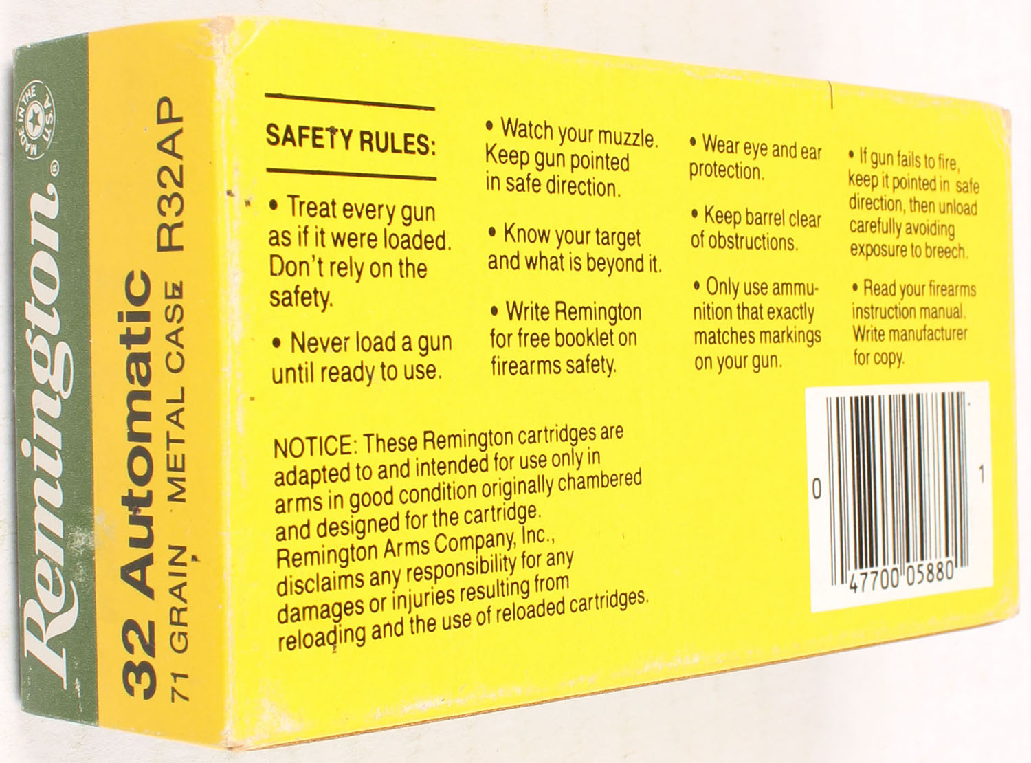 | Remington, High Velocity, .32 Automatic, 71 Grain Metal Case, Fu...