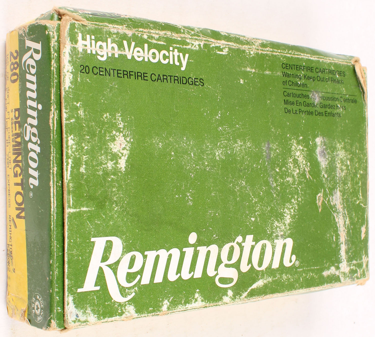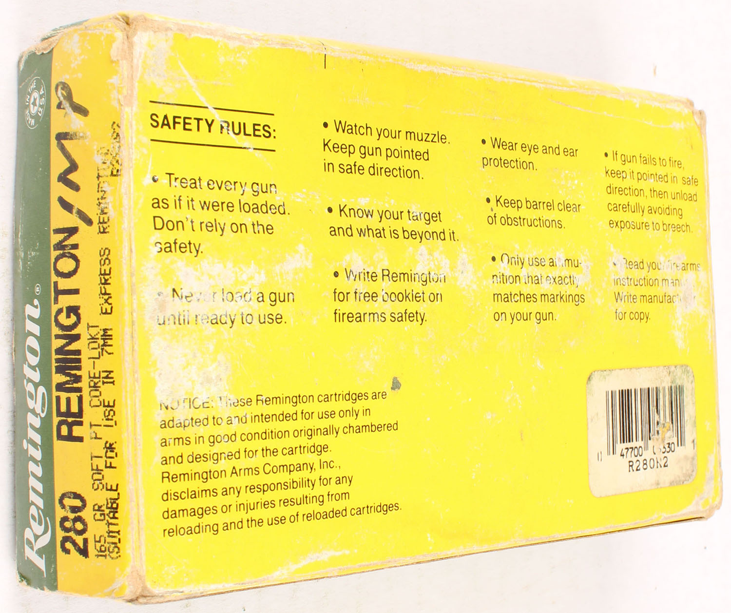 Remington, High Velocity, 280 Remington, 165 Grain Pointed Soft Point Core-Lokt, Full, 1pc. Yellow, green, white & black box, box is solid with good color, shelf wear, edge & corner wear, end flaps are solid, ammo is excellent. Grade: Very Good ++ - Value: 10 to 50