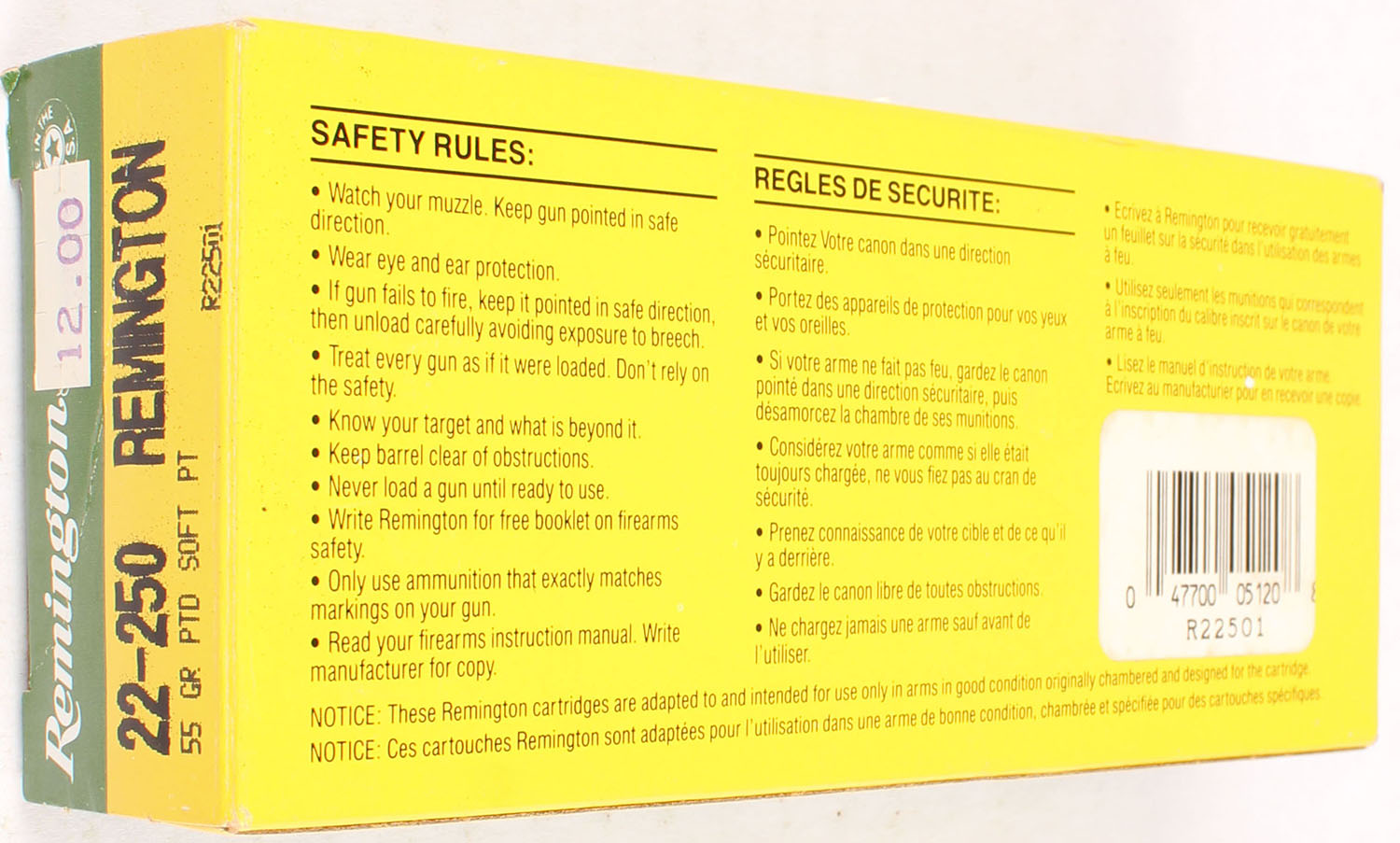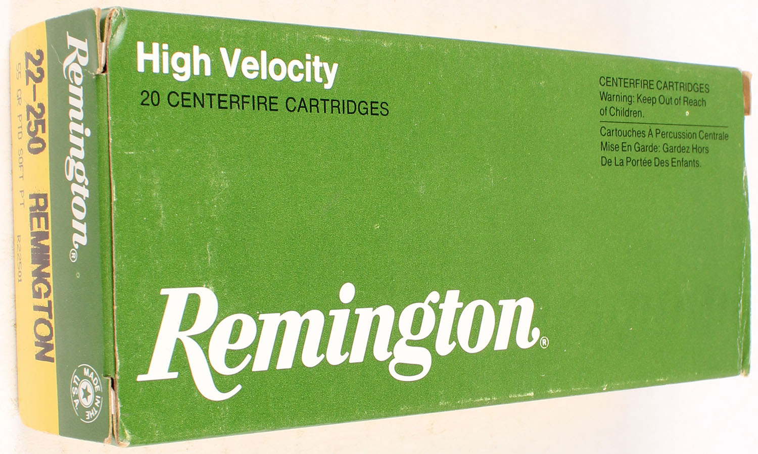 Remington, High Velocity, 22-250 Remington, 55 Grain Pointed Soft Point, Full, 1pc. Yellow, green, white & black box, box is very solid with great color, end flaps are solid, ammo is excellent. Grade: Excellent + - Value: 10 to 50