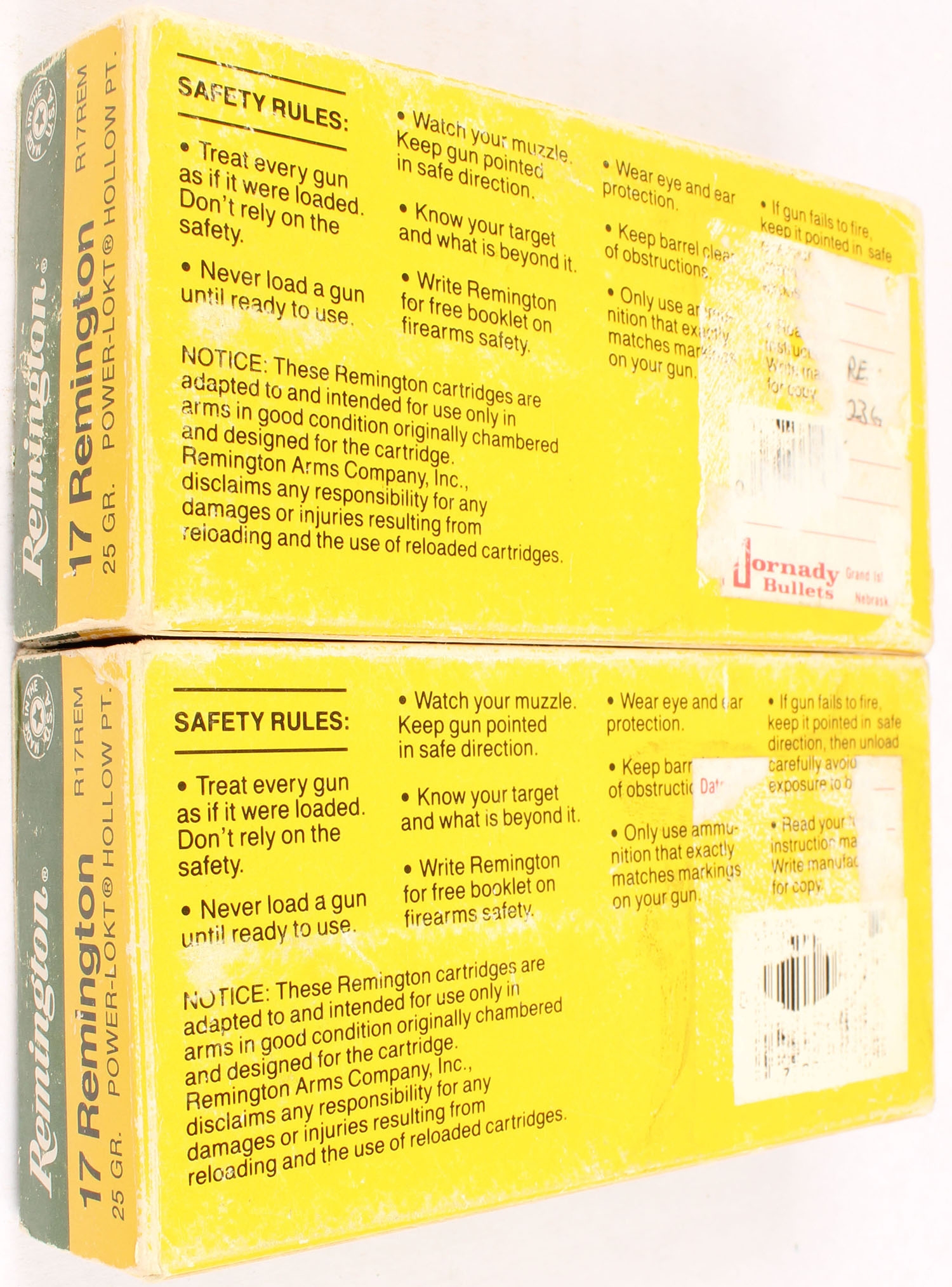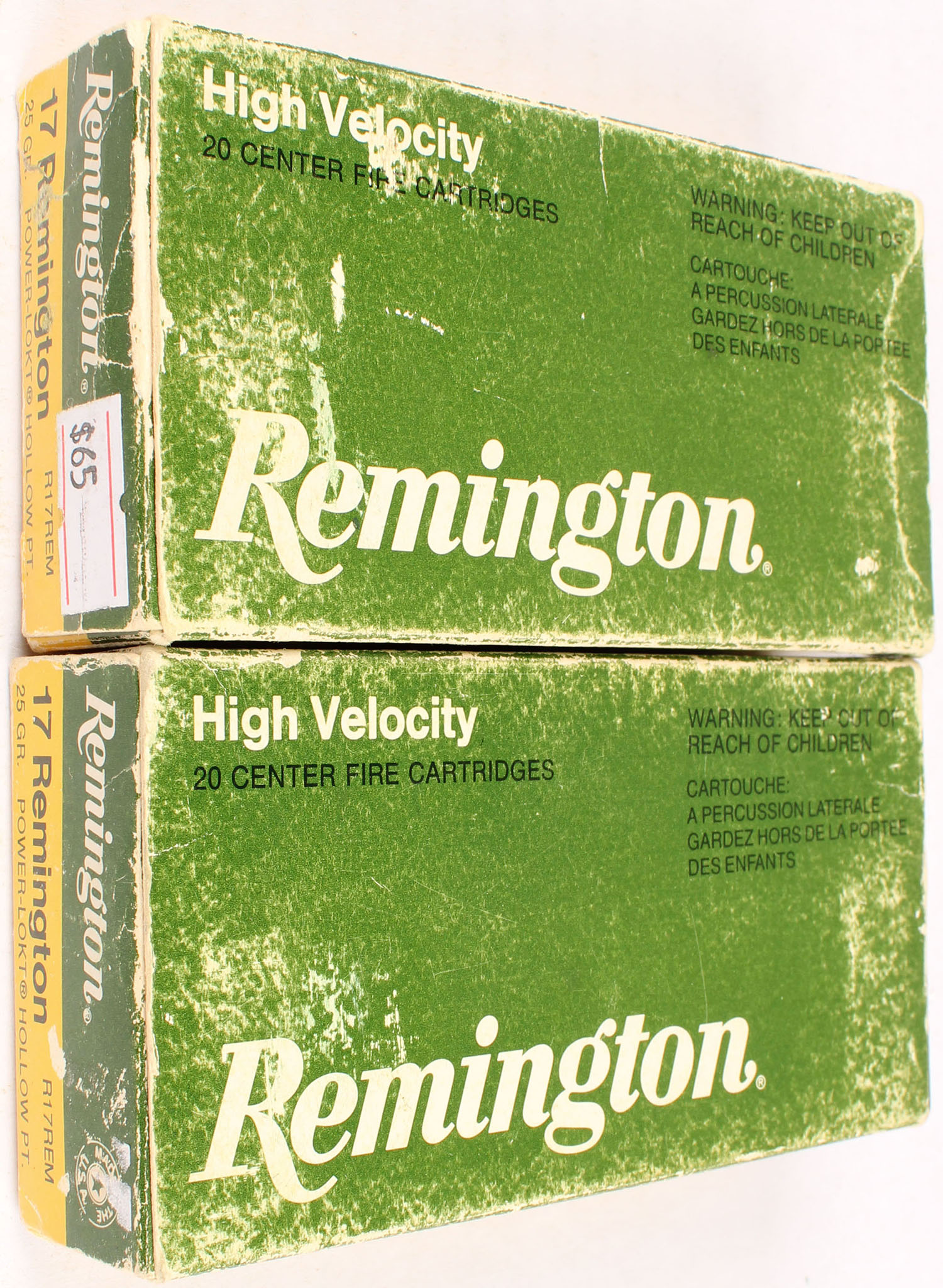 Lot of 2 Remington, High Velocity, 17 Remington, 25 Grain Power-Lokt Hollow Point, Full, 1pc. Yellow, green, white & black box, box is solid with good color, end flaps are solid, shelf wear, edge & corner wear, ammo is excellent. Grade: Very Good ++ - Value: 10 to 50