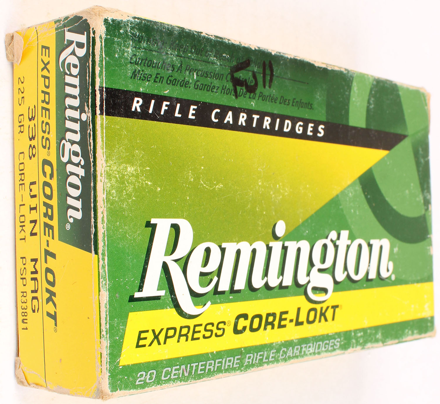 Remington, Express Core-Lokt, 338 Win Mag, 225 Grain PSP, Full, 1pc. Yellow, green, white & black box, box is solid with good color, end flaps are solid, edge & corner wear, light shelf wear, ammo is excellent. Grade: Very Good ++ - Value: 10 to 50