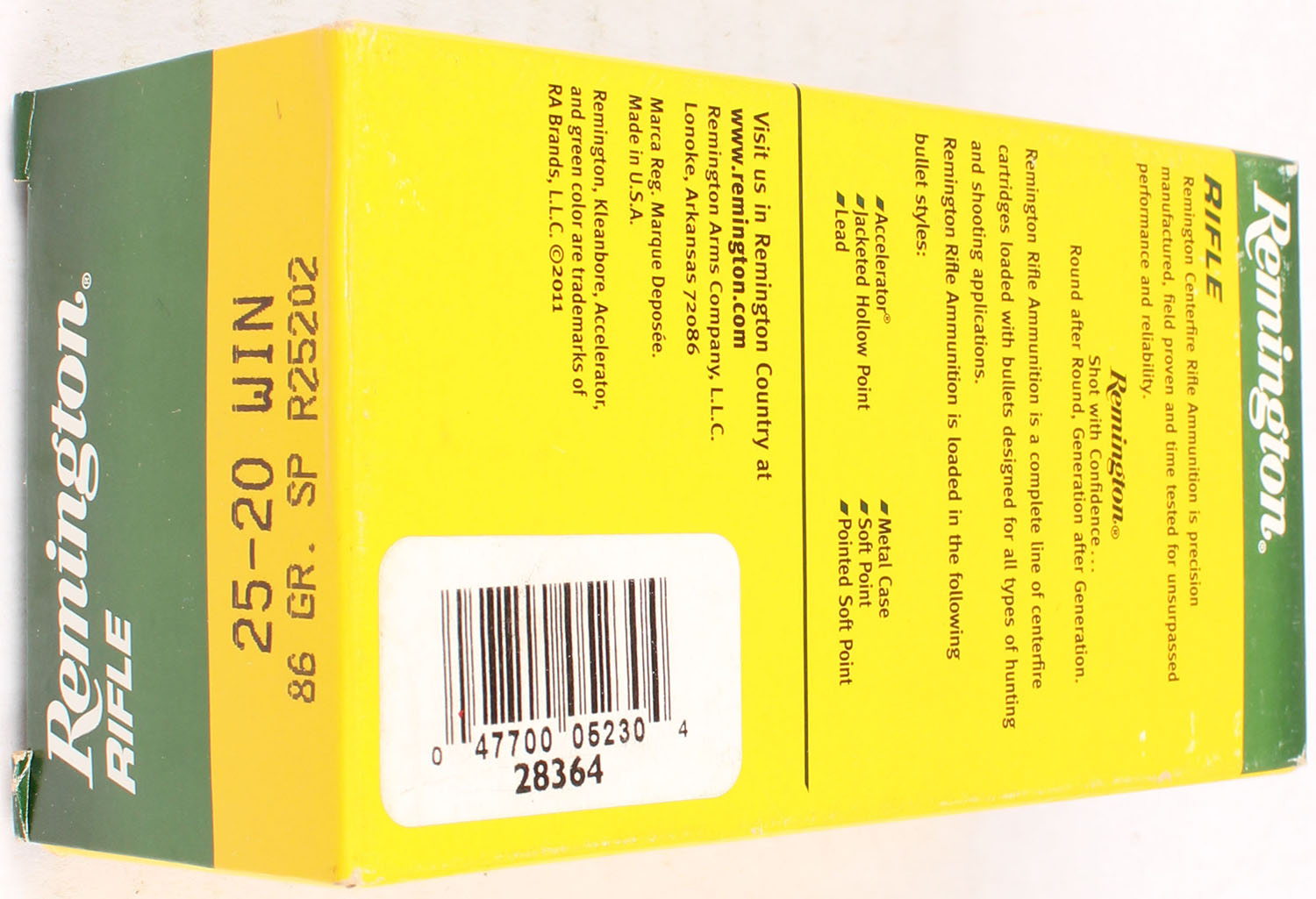 | Remington, Rifle, 25-20 Win, 86 Grain SP, Full, 1pc. Yellow, gre...