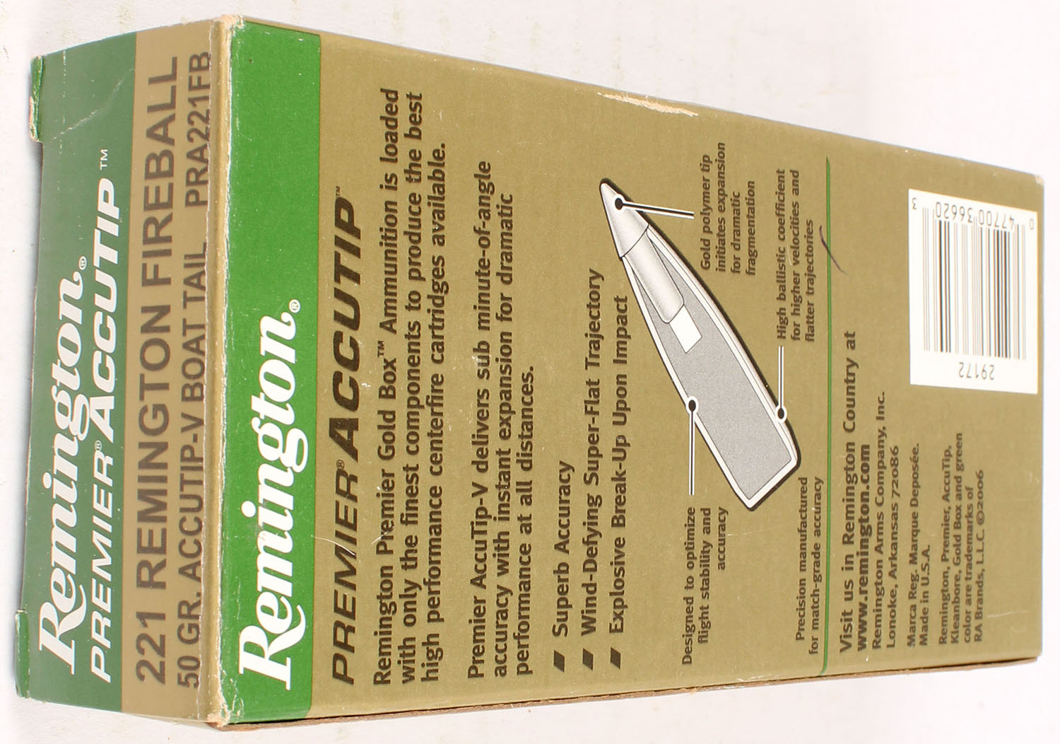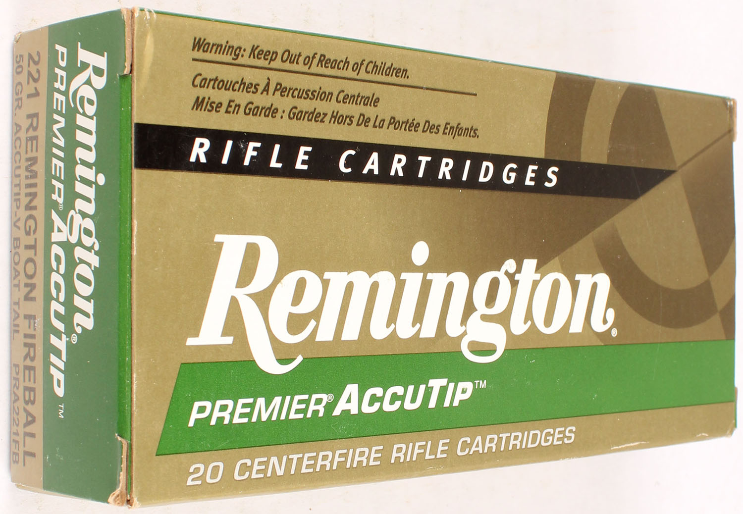 Remington, Premier AccuTip, 221 Remington Fireball, 50 Grain AccuTip-V Boat Tail, Full, 1pc. Gold, green, white & black box, box is very solid with great color, light edge wear, end flaps are solid, ammo is excellent. Grade: Excellent - Value: 20 to 80