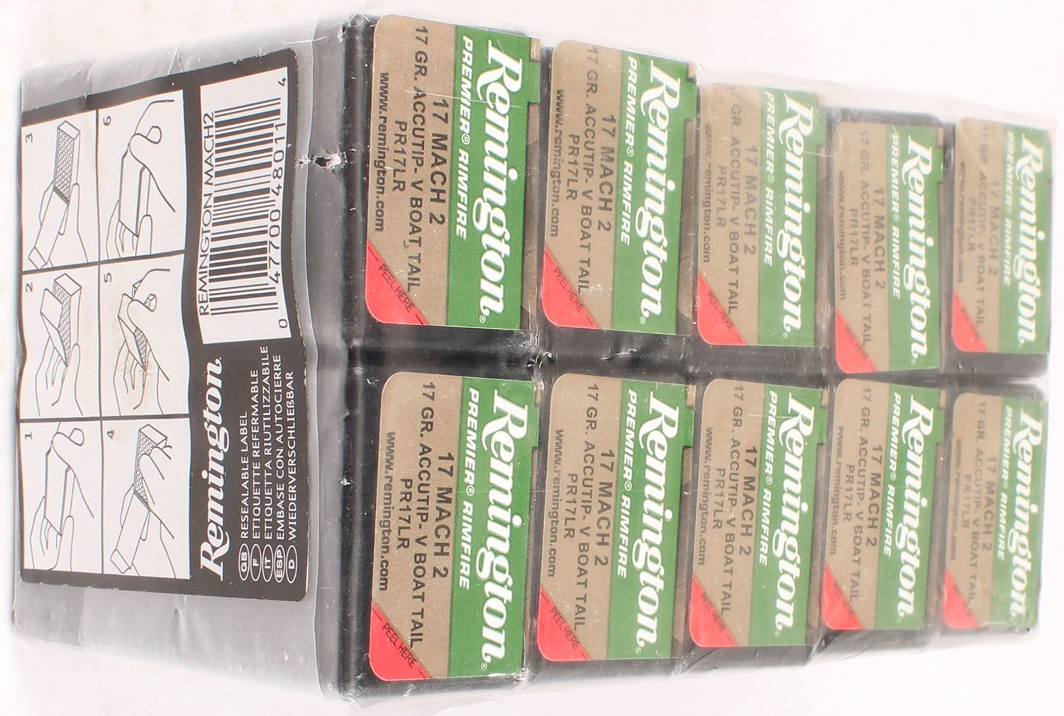 Sealed Case of Remington, Premier Rimfire, 17 Mach 2, 17 Grain AccuTip-V Boat Tail, FULL & SEALED, 1pc. Gold, green, white & black box, box is solid with very nice color, case is solid. Grade: Excellent - Value: 20 to 80