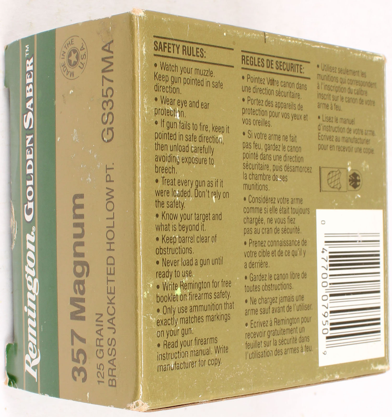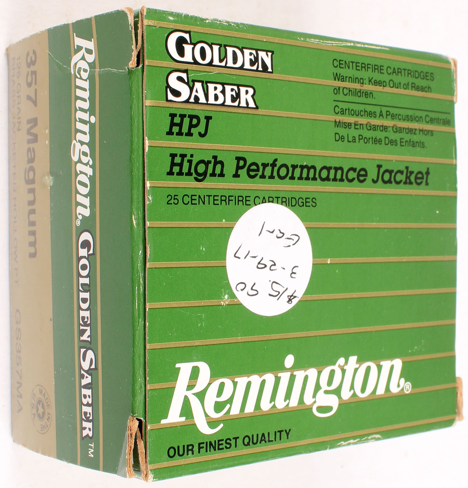 Remington, Golden Saber, 357 Magnum, 125 Grain Brass Jacketed Hollow Point, Full, 1pc. Gold, green, white & black box, box is solid with very good color, light edge & corner wear, light shelf wear, end flaps are solid, ammo is excellent. Grade: Excellent - Value: 20 to 80