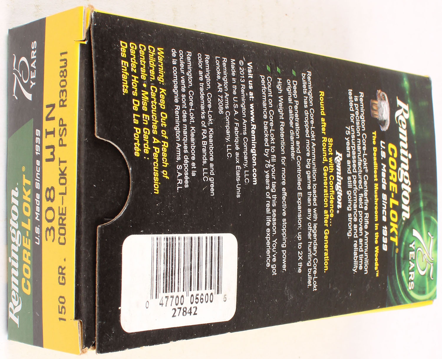 Remington, 75 Years, 308 Win, 150 Grain Core-Lokt PSP, Full, 1pc. Yellow, green, white & black box, box is very solid with great color, end flaps are solid, ammo is excellent. Grade: Excellent ++ - Value: 20 to 80