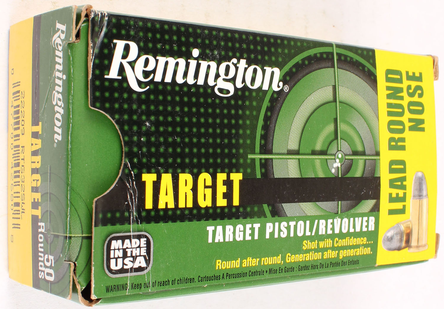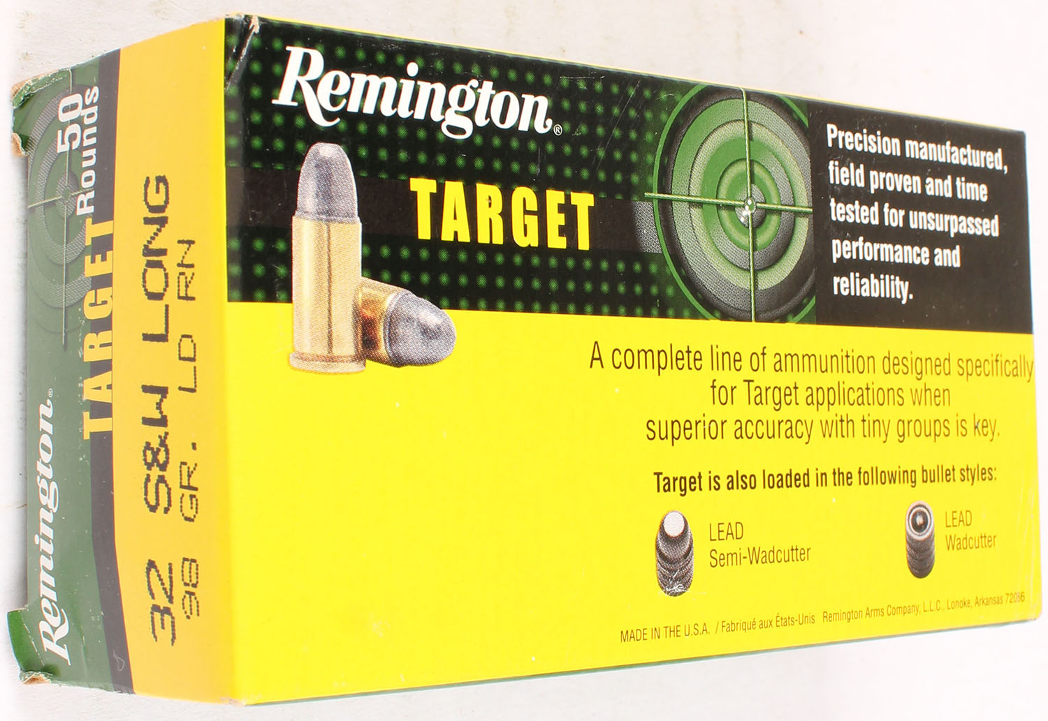 Remington, Target, 32 S&W Long, 98 Grain Lead Round Nose, Full, 1pc. Yellow, green, white & black box, box is solid with great color, light corner wear, end flaps are solid, ammo is excellent. Grade: Excellent - Value: 20 to 80