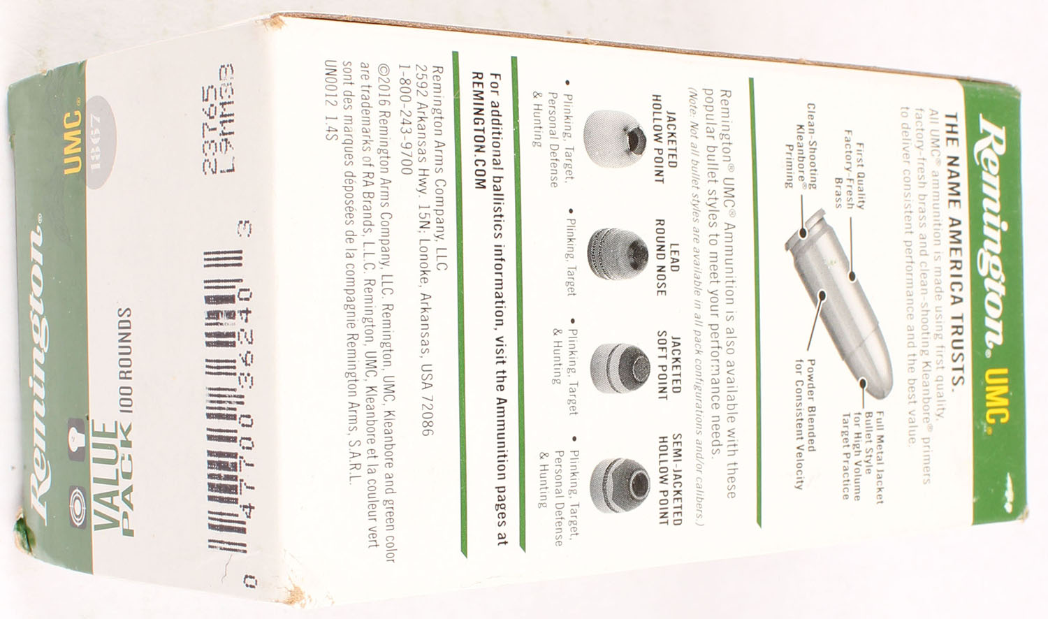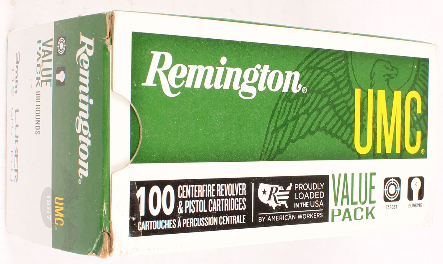 Remington, UMC, 9mm Luger, 115 Grain FMJ, Full, 1pc., green, white & black box, box is solid with great color, light corner wear, end flaps are solid, ammo is excellent. Grade: Very Good ++ - Value: 20 to 80