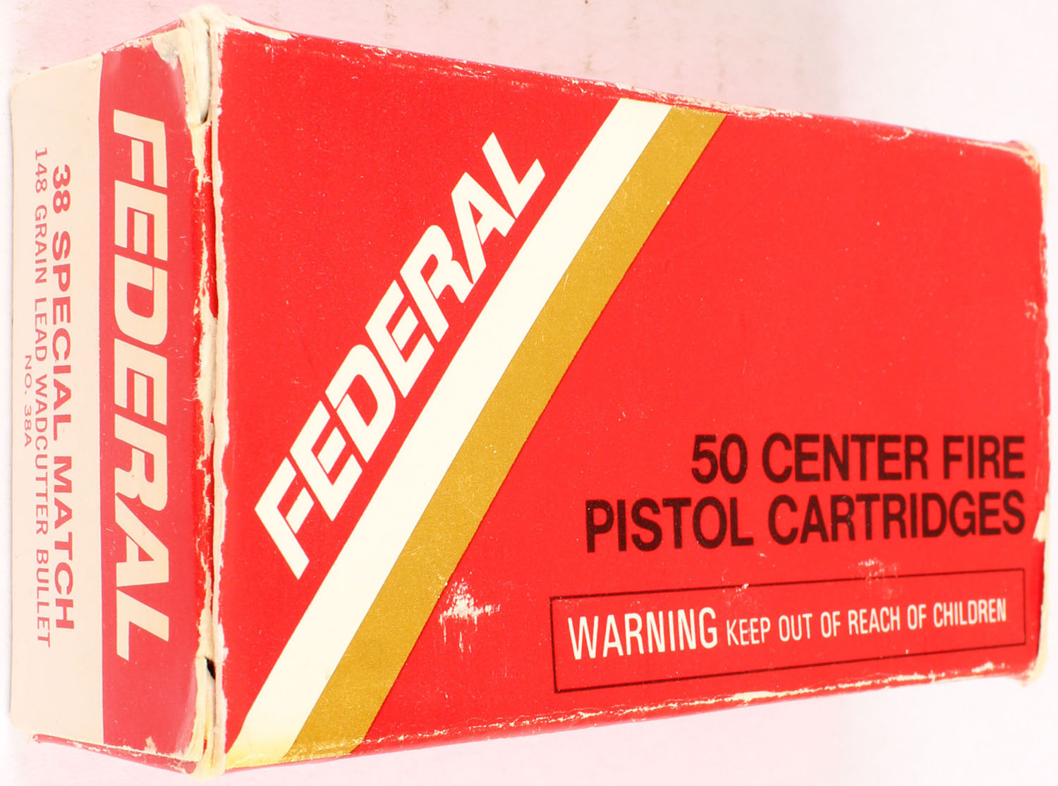 Federal, 38 Special Match, 148 Grain Lead Wadcutter Bullet, Full, 1pc., red, white & black box, box is solid with very good color, light corner & edge wear, end flaps are solid, ammo is excellent. Grade: Very Good ++ - Value: 20 to 80