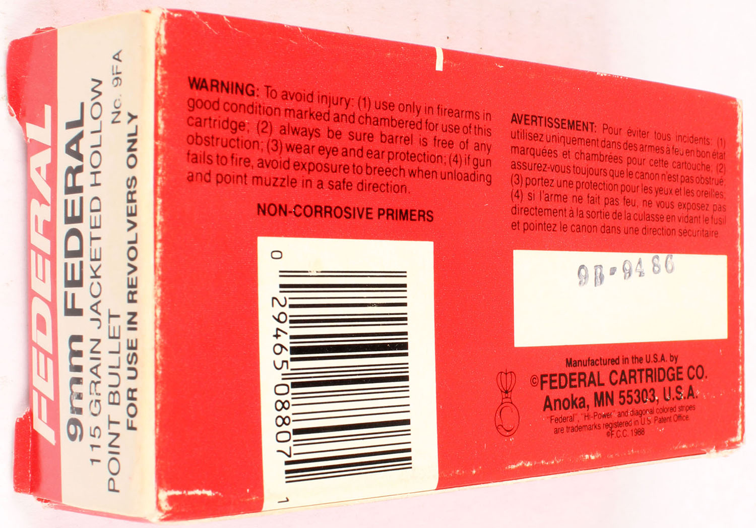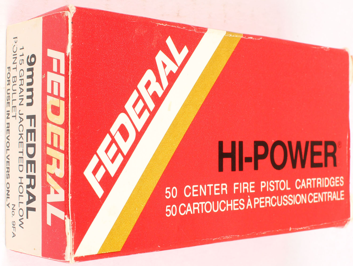 Federal, Hi-Power, 9mm Federal Rimmed For Revolvers only, 115 Grain Jacketed Hollow Point Bullet, Full, 1pc., red, white & black box, box is solid with very good color, light corner & edge wear, end flaps are solid, ammo is excellent. Grade: Excellent - Value: 20 to 250