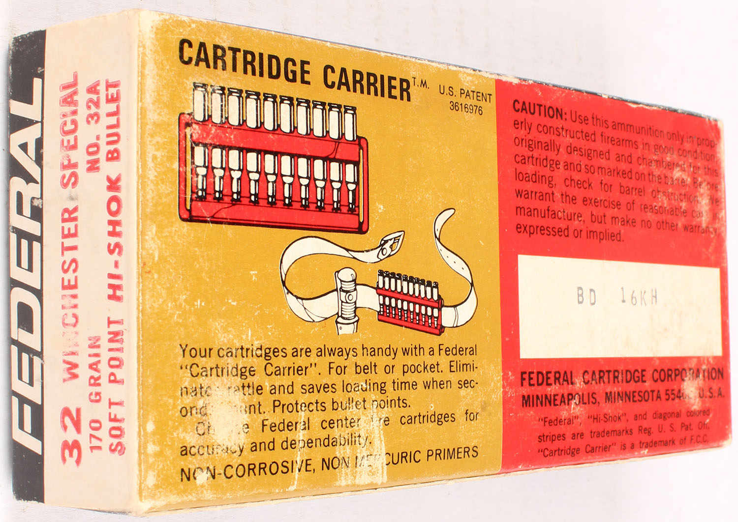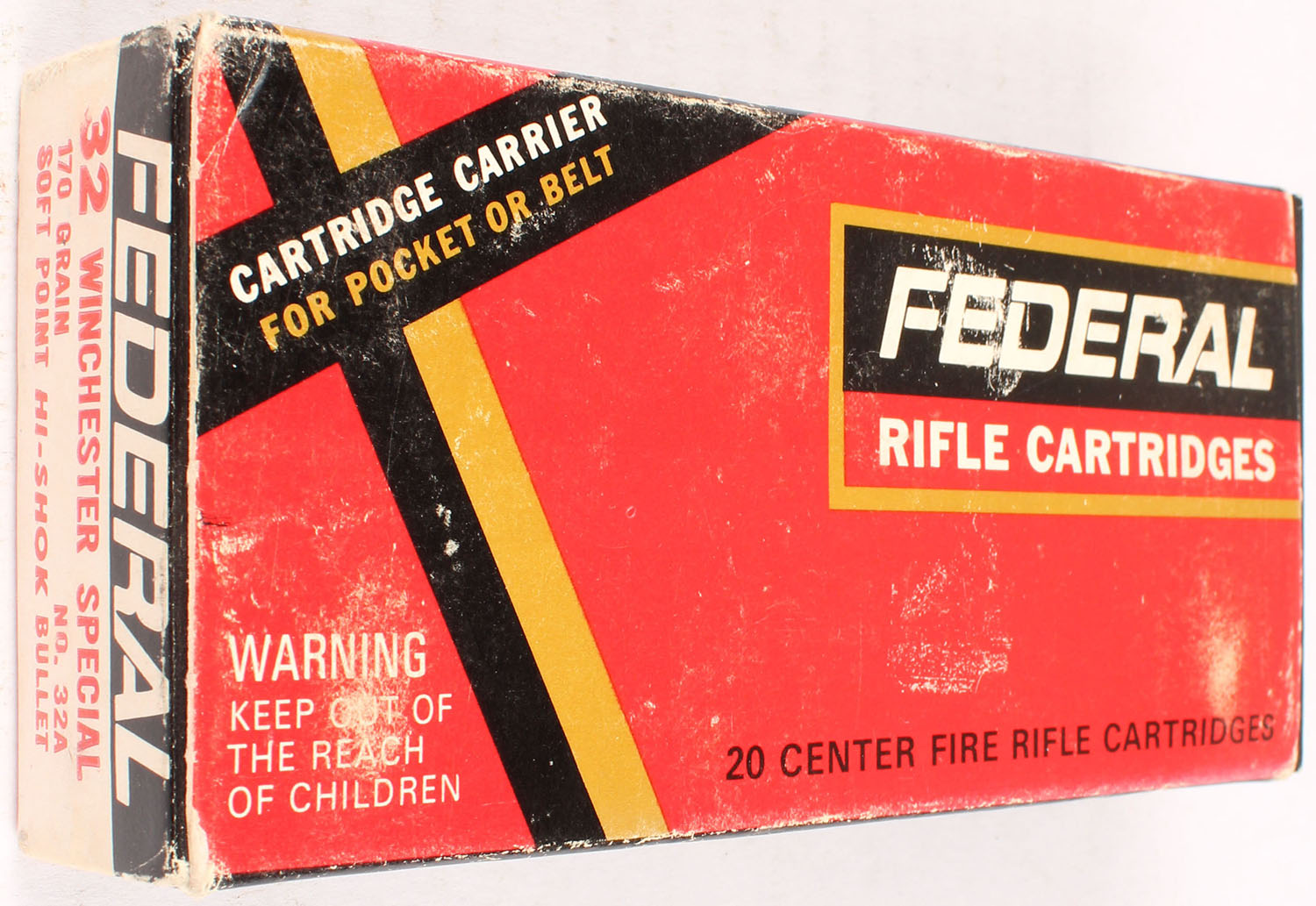 Federal, 32 Win Special, 170 Grain Soft Point Hi-Shok, Full, 1pc., red, white & black box, box is solid with very good color, light corner wear, shelf wear, end flaps are solid, ammo is excellent. Grade: Very Good ++ - Value: 20 to 80