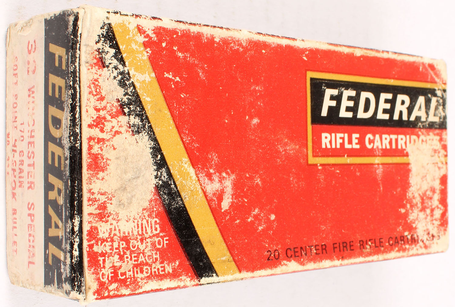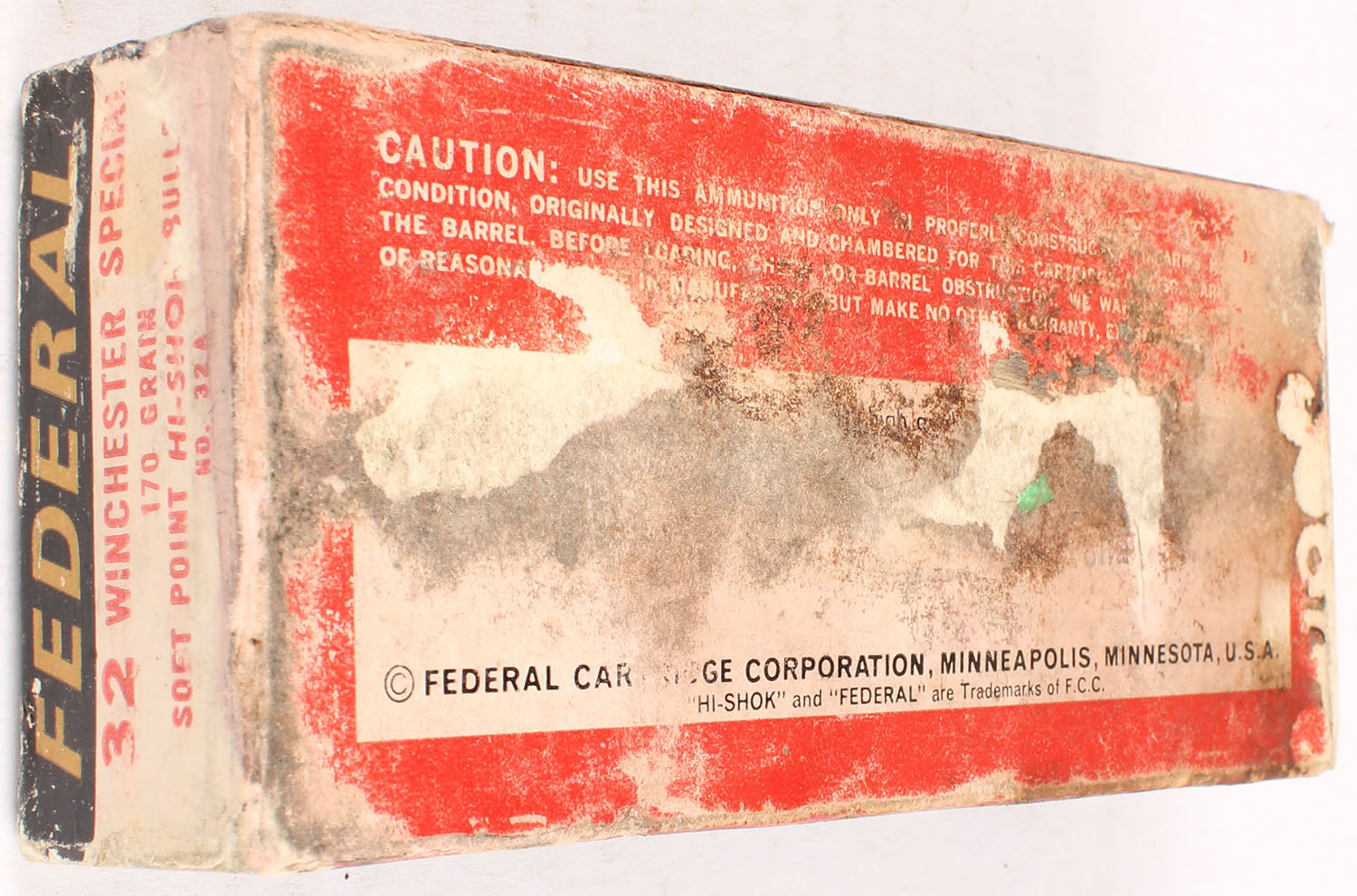 Federal, 32 Winchester Special, 170 Grain Soft Point Hi-Shok, Full, 1pc., red, white & black box, box is solid with very good color, edge & corner wear, shelf wear, soiling, end flaps are solid, ammo is very good. Grade: Very Good ++ - Value: 10 to 40