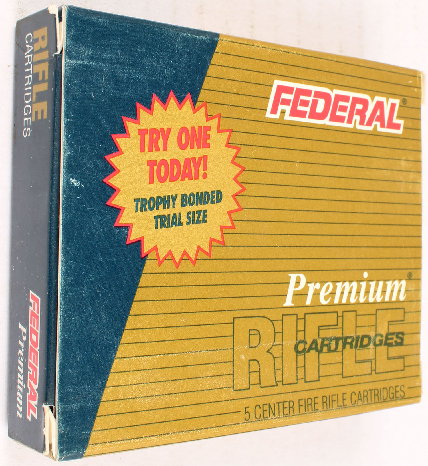 Federal, 7mm Rem Magnum, 175 Grain Trophy Bonded, Full, 1pc., multi-colored box, box is solid with very good color, minor shelf wear, end flaps are solid, ammo is excellent. Grade: Excellent + - Value: 10 to 40