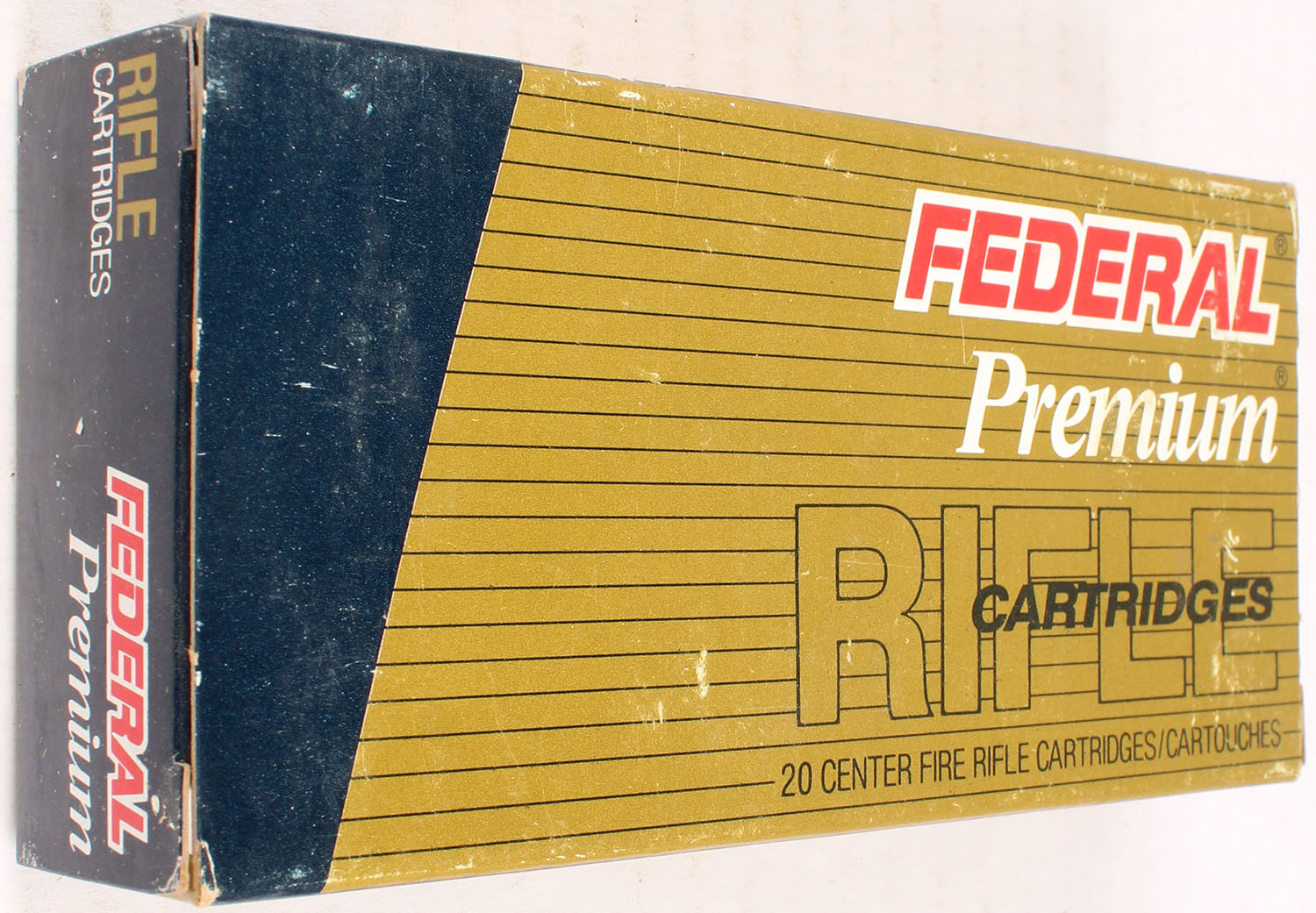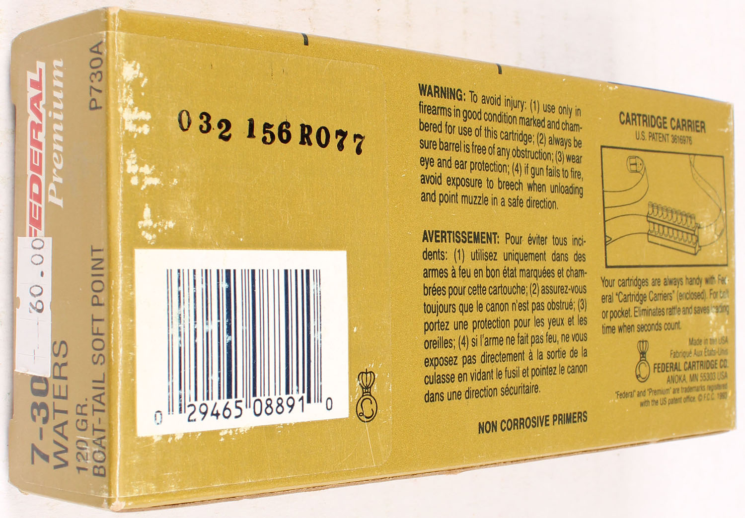 Federal, Premium, 7-30 Waters, 120 Grain Boat-Tail Soft Point, Full, 1pc., multi-colored box, box is solid with great color, minor shelf wear, end flaps are solid, ammo is excellent. Grade: Excellent + - Value: 20 to 80