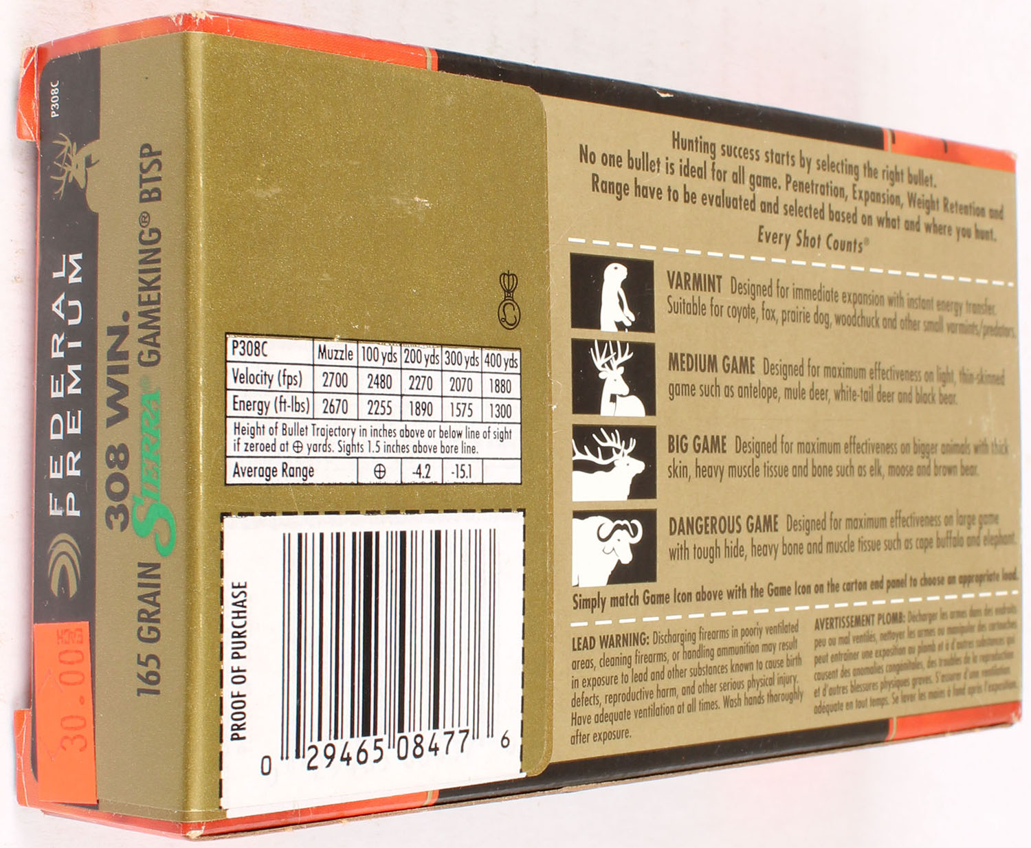 Federal, Vital-Shok, 308 Win, 165 Grain Sierra Gameking BTSP, Full, 1pc., multi-colored box, box is solid with great color, light corner wear, end flaps are solid, ammo is excellent. Grade: Excellent - Value: 20 to 80