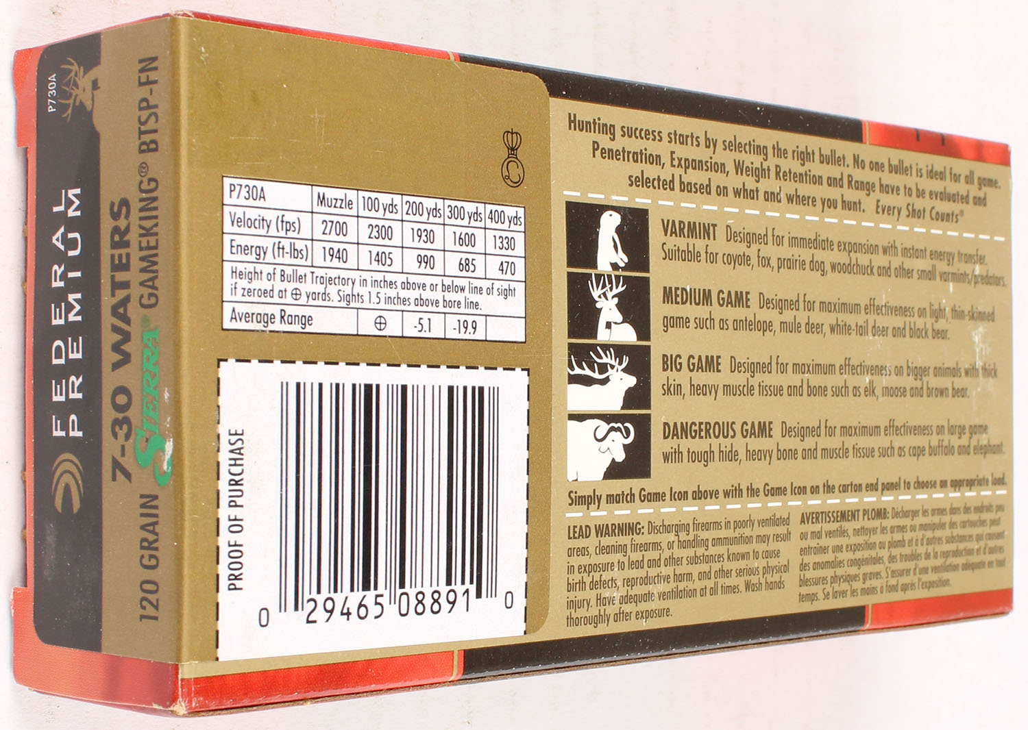 Federal, Vital-Shok, 7-30 Waters, 120 Grain Sierra Gameking BTSP-FN, Full, 1pc., multi-colored box, box is solid with great color, light shelf wear, end flaps are solid, ammo is excellent. Grade: Excellent - Value: 20 to 80