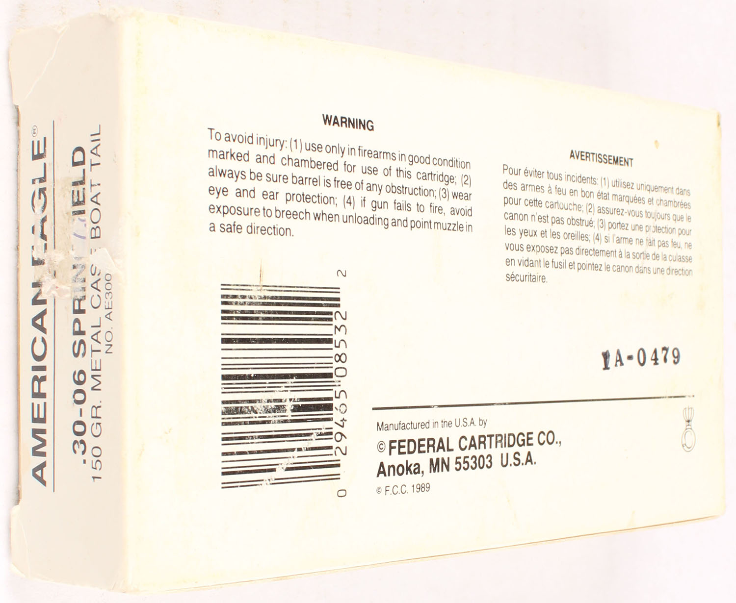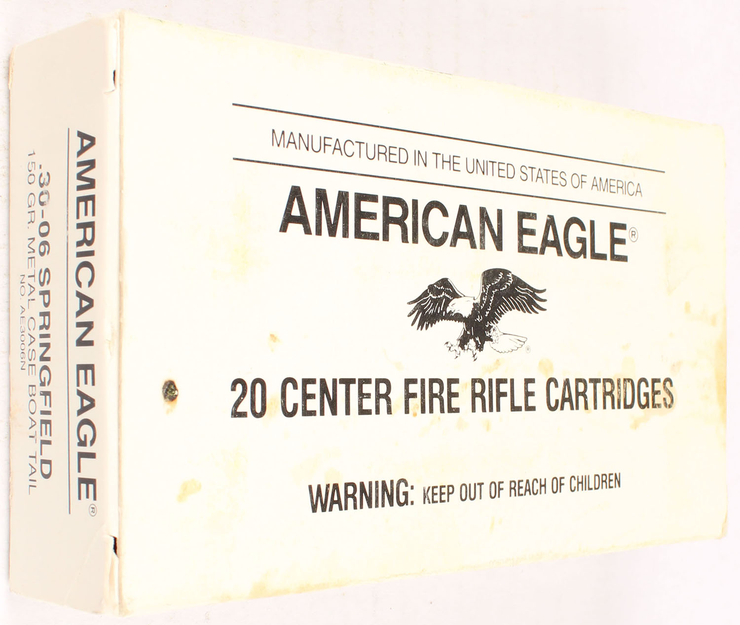 American Eagle, 30-06 Springfield, 150 Grain Metal Case Boat Tail, Full, 1pc., black & white box, box is solid with good color, soiling, light edge & corner wear, end flaps are solid, ammo is excellent. Grade: Very Good ++ - Value: 20 to 80