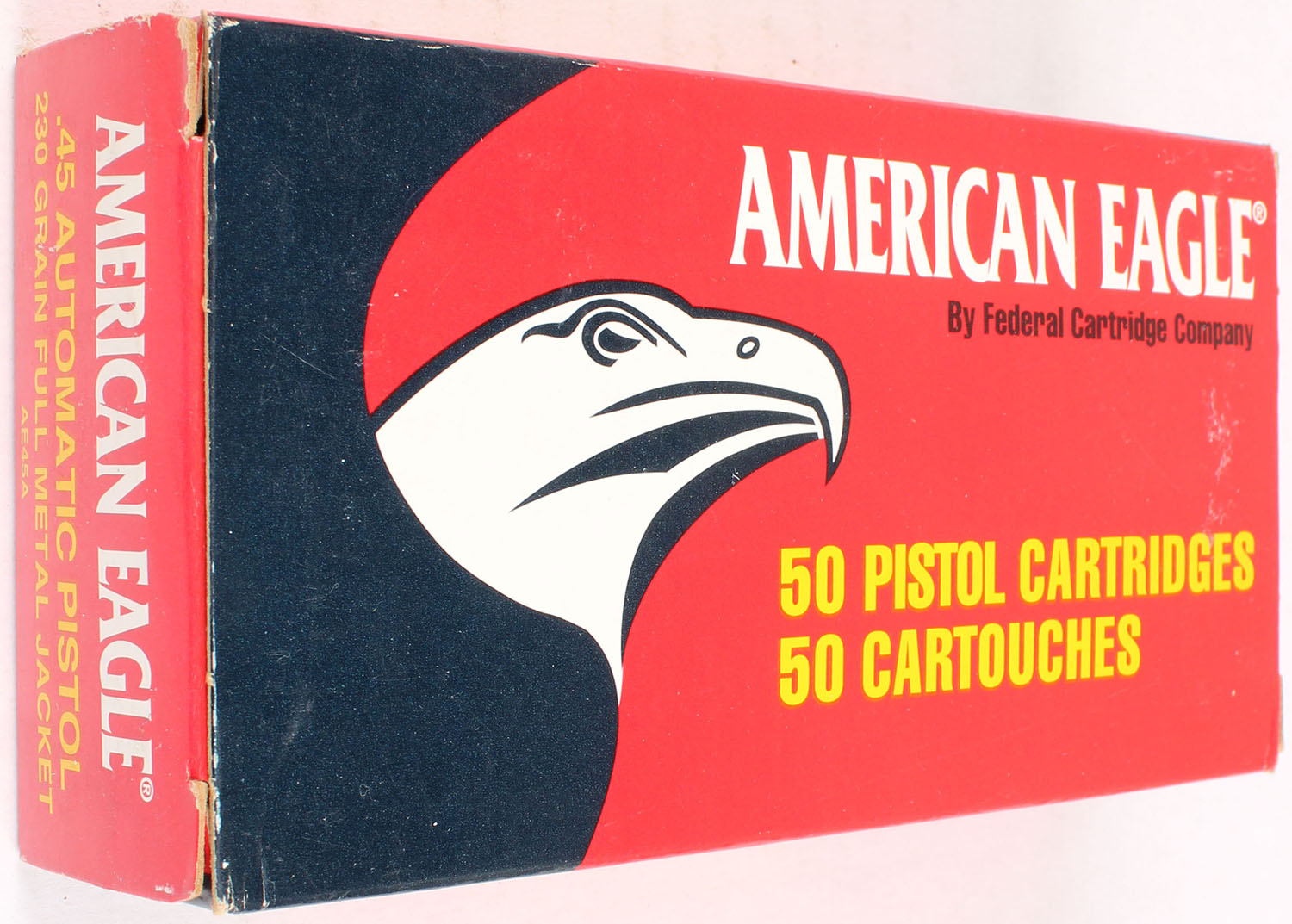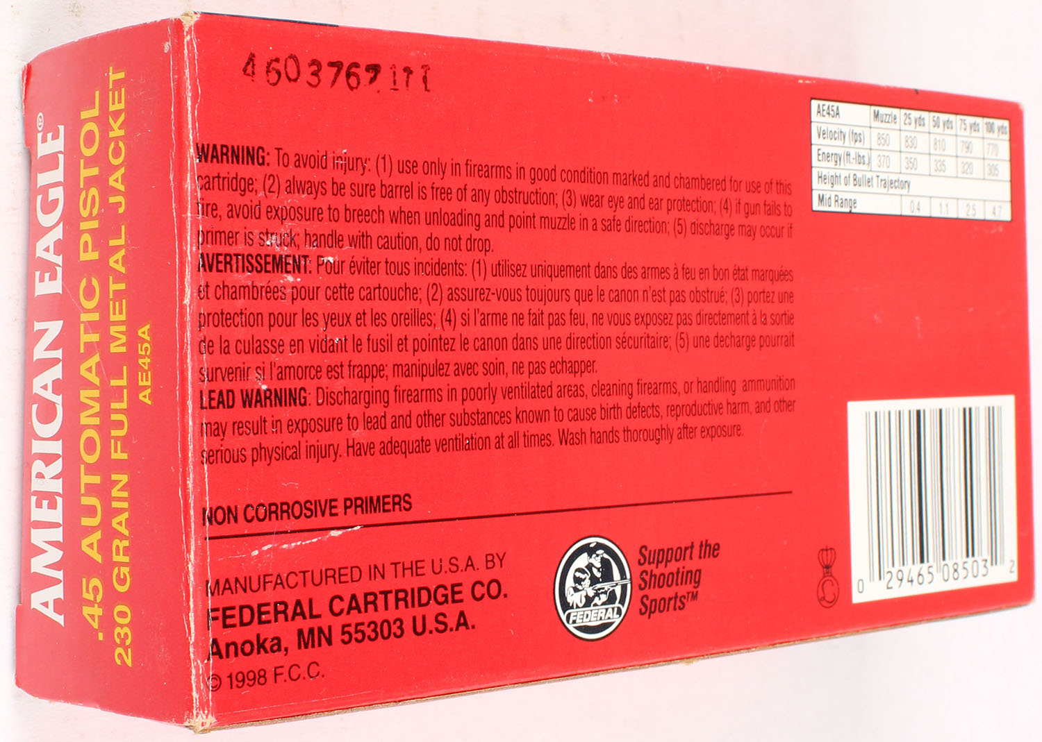 American Eagle, 45 Auto, 230 Grain FMJ, Full, 1pc., multi-colored box, box is solid with great color, light shelf wear, end flaps are solid, ammo is very good. Grade: Excellent + - Value: 10 to 50