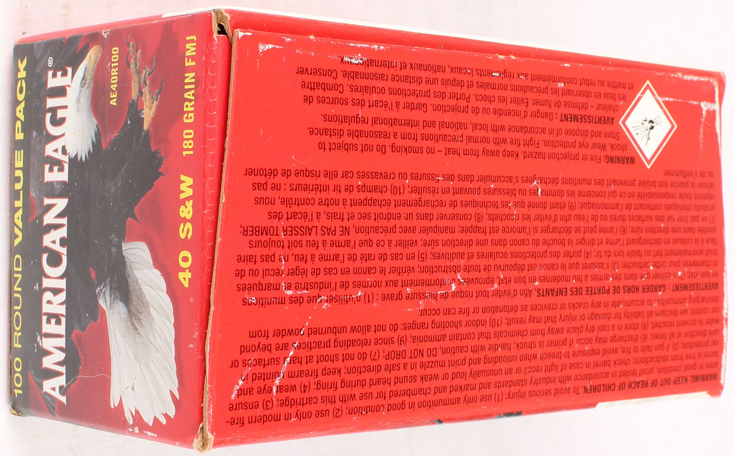 American Eagle, 40 S&W, 180 Grain FMJ, FULL & SEALED, 1pc., multi-colored box, box is solid with great color, light edge & corner wear, end flaps are solid. Grade: Excellent - Value: 10 to 50